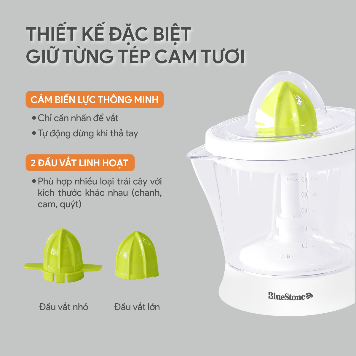 - Trang bị 2 đầu vắt, phù hợp với nhiều kích cỡ cam khác nhau