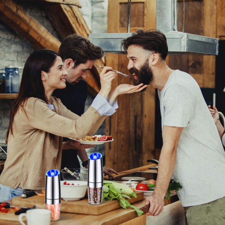 - Máy Nghiền Hạt Tiêu sáng tạo phân tán gia vị với đèn LED màu xanh bật khi máy xay hạt tiêu đang hoạt động.