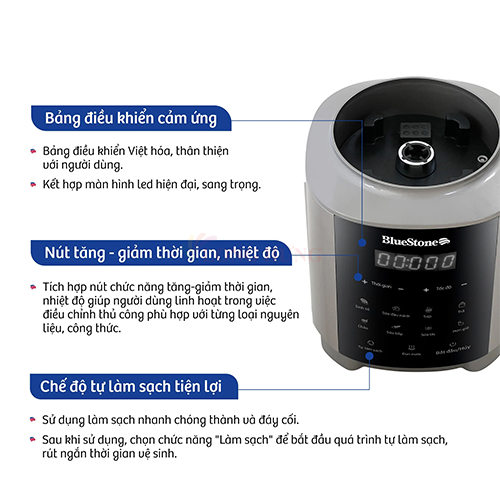 Máy xay nấu đa năng Bluestone BLB-6033 Công suất xay: 800W; Công suất nấu: 800W 6 chế độ gia nhiệt: sữa hạt, sữa đậu nành, hâm nóng/giữ ấm, cháo, súp, sữa bắp. 3 chế độ