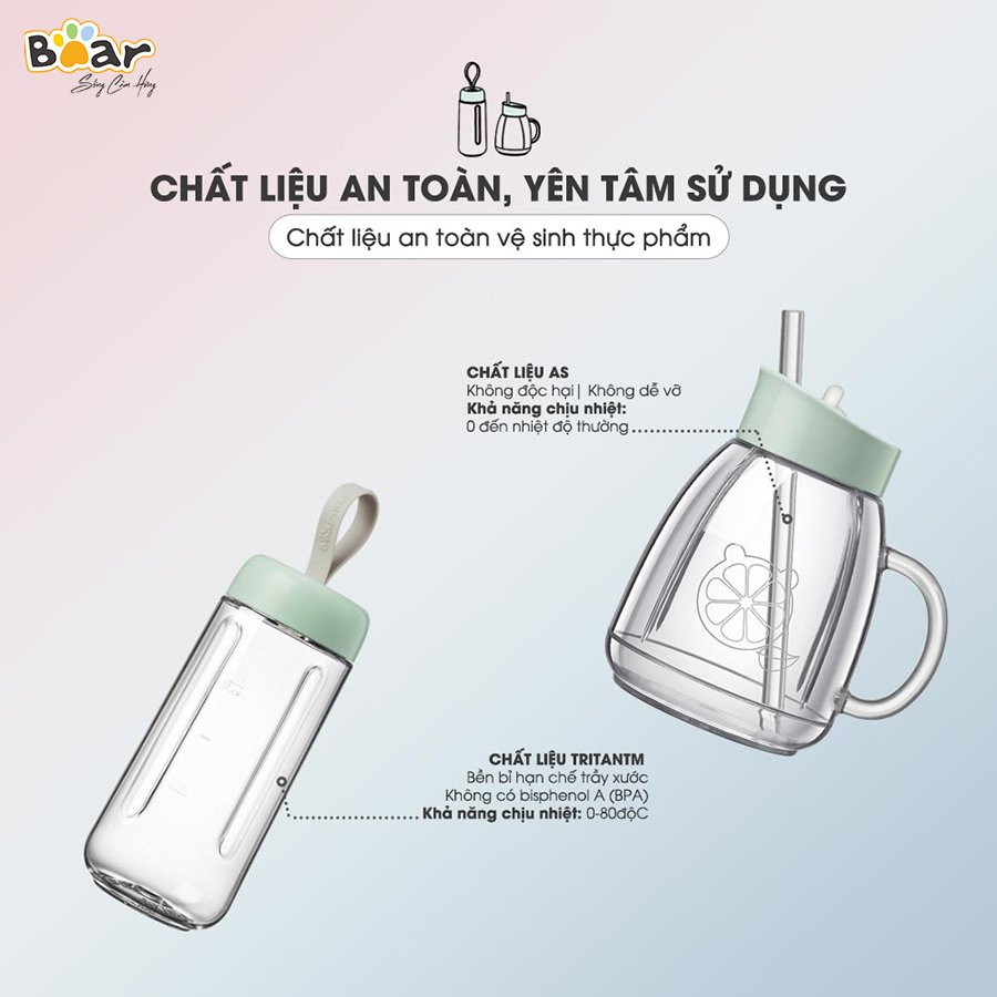 Các sản phẩm gia dụng của Bear đều được sản xuất trên phương châm đề cao yếu tố an toàn với sức khỏe người sử dụng. Và máy xay sinh tố Bear LLJ - D04A1 cũng không phải ngoại lệ. 2 cối xay lần lượt được làm từ chất liệu nhựa ABS và Tritan cao cấp, có khả năng chịu được sự thay đổi của nhiệt độ, không chứa các chất gây hại cho sức khỏe và môi trường.