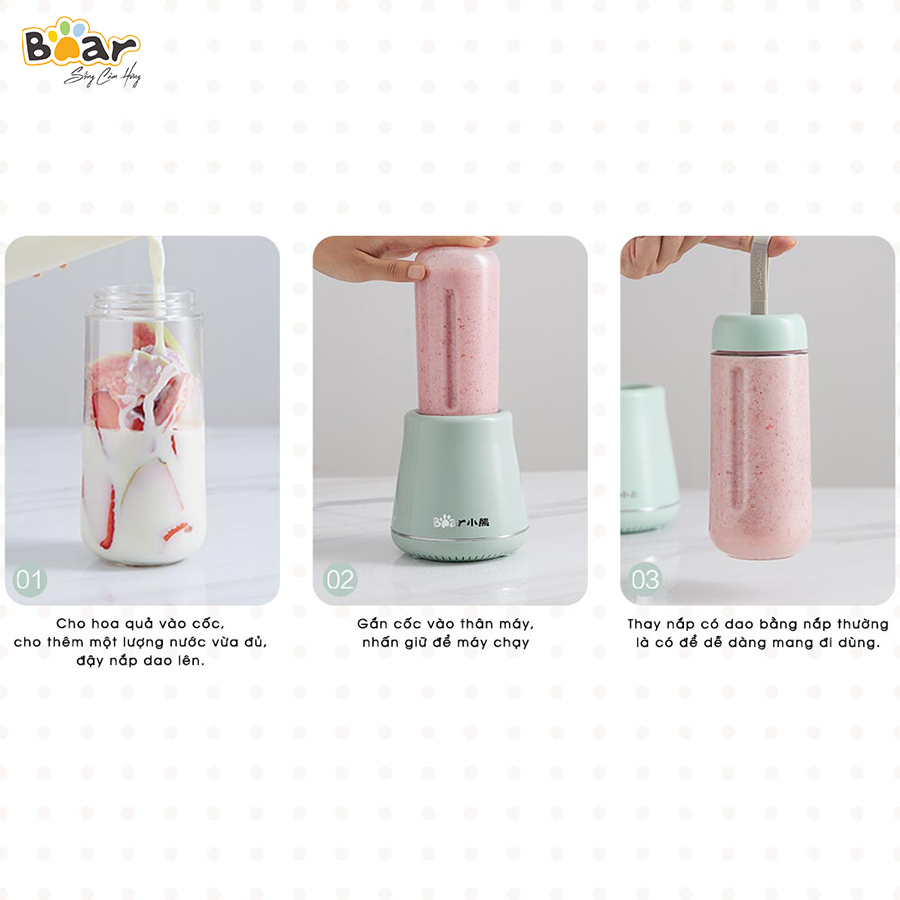 Có lẽ, ưu điểm lớn nhất của chiếc máy xay cầm tay Bear LLJ - D04A1 mà các loại máy xay chuyên dụng cỡ lớn không có được chính là thiết kế nhỏ gọn và tiện lợi. Với kích thước chỉ bằng một bình nước, bạn có thể dễ dàng bỏ chúng vào balo, túi xách và mang theo đến bất cứ đâu: Khi đi du lịch, picnic, đi học, đi làm, đến phòng tập gym,