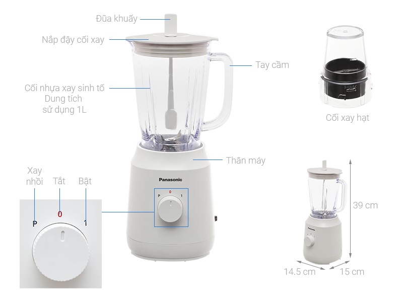 Panasonic MX-EX1011WRA gồm 2 cối xay: Cối to dung tích 1 lít để xay sinh tố, cháo nguội, xay thực phẩm, xay sú Cối nhỏ xay hạt khô với lượng tối đa 50g.
