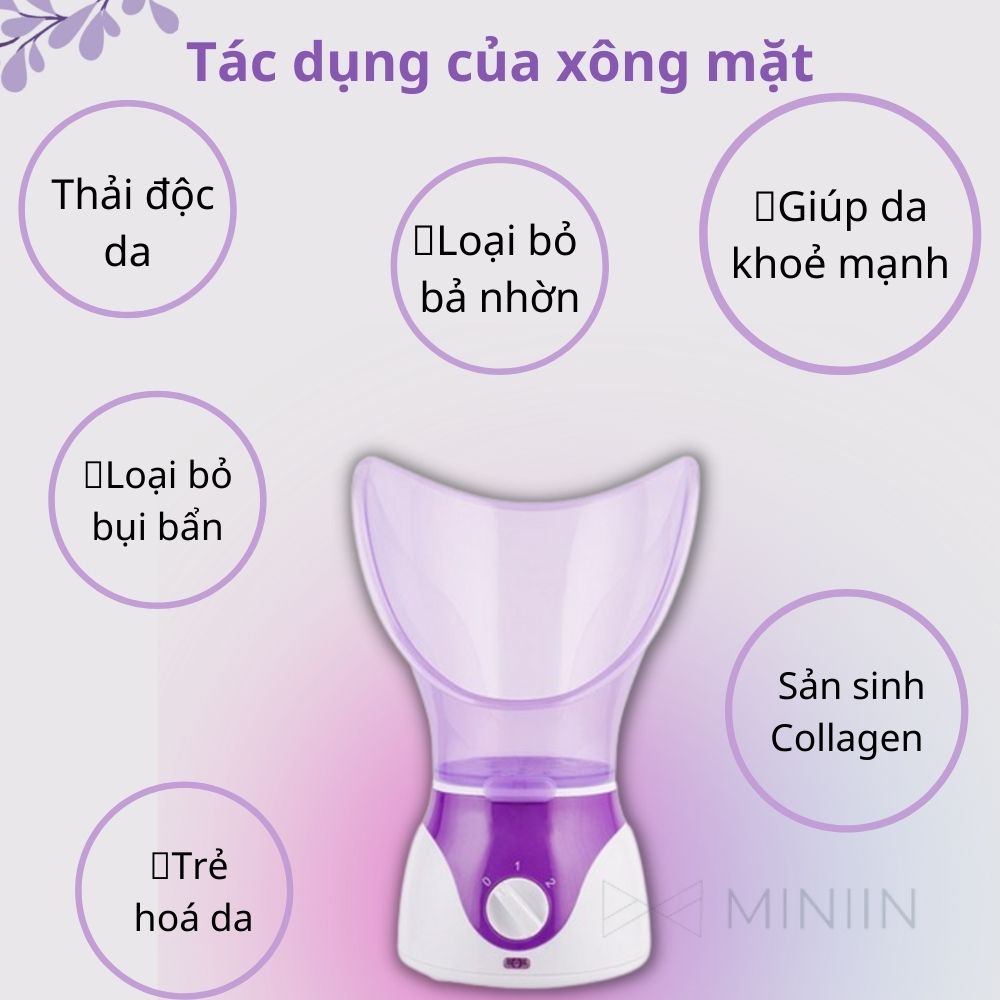 Máy Xông Tinh Dầu Mặt Mũi Họng Mini Hàng Chính Hãng MINIIN - Xông Hơi Thảo Dược Hoa Quả Tại Nhà - An Toàn Hiệu Quả Máy Xông Hơi Mặt Tại Nhà là máy tốt nhất hiện nay mà nhà ai cũng nên có 1 chiếc ,Máy giúp chăm sóc làn da mềm mịn tăng tính đàn hồi cho da trẻ hóa làn da. Máy có bầu xông mũi, ngăn chứa thảo dược, giúp bạn cải thiện rất tốt các vấn đề về mũi, hô hấp. Với một chiếc máy xông hơi mặt nhỏ gọn phù hợp với tất cả thành viên trong gia đình và người xông có thể dễ dàng điều chỉnh lượng hơi nước xông và tinh dầu kèm theo để đạt kết quả tốt nhấ Máy Xông Hơi Mặt có công dụng nào? Máy xông hơi mặt là phương pháp làm sạch da không gây dị ứng, không gây tác dụng phụ vì không có bất cứ một chất hóa học nào khác ngoài hơi nước tinh khiết – Xông hơi giúp đuổi tà khí xâm nhập vào các đường kinh lạc gây đau nhức cơ thể. Hơi nóng từ xông hơi sẽ giúp làm giãn các mạch máu dưới da, giúp máu đến nuôi da nhiều hơn. – Làm cho các lỗ chân lông được mở ra, các tế bào da được thư giãn đồng thời độc tố trong cơ thể cũng được bài tiết ra ngoài. – Giải quyết tận gốc nguyên nhân gây mụn, trứng cá và viêm nhiễm trên da mặt; Làm sạch da mặt một cách triệt để. – Có thể kết hợp với hương liệu thiên nhiên như hoa quả, thảo dược, tinh dầu hoặc dược phẩm, mỹ phẩm cùng liệu pháp massage sẽ tạo nên tác động kép, giúp cho việc hấp thụ tốt nhất các sản phẩm chăm sóc da làm cho da mềm mịn, tăng tín đàn hồi, trẻ hóa làn da mang lại cho bạn vẻ đẹp rạng ngời, căng tràn sức sống. – Máy tạo độ ẩm cho da , giúp bạn có được làn da cân bằng , không còn bị da khô , không còn bị da nhờn Máy Xông Hơi Mặt còn giúp cơ thể phân hủy một lượng mỡ nhất định để điều nhiệt. Nếu bạn có một thực đơn ăn kiêng vừa phải cùng với xông hơi thì bạn vẫn có thể giảm nhẹ nhàng mà không bị nhăn da. Ưu điểm của Máy Xông Hơi Mặt – Máy là một liệu pháp chăm sóc da hoàn toàn thiên nhiên theo truyền thống y học cổ truyền của dân tộc. – Máy Xông Hơi Mặt tại nhà giúp chị em có thể xông hơi mặt như ở thẩm mỹ viện bất cứ khi nào. Luồng hơi nước tinh khiết và ấm áp sẽ thấm rất sâu vào các lỗ chân lông , đẩy các chất cặn bã ra ngoài da. Nhờ vậy, da phục hồi nhanh chóng và lại trở nên căng mịn – Máy đặc biệt rất thích hợp cho các chị em phải tẩy trang hằng ngày. Máy xông hơi mặt phù hợp với tất cả mọi loại da, giúp bạn có được làn da sạch sẽ, láng mịn, không còn mụn cám – Máy giúp thải độc cho da mặt. Nó rất hiệu quả trong việc điều trị nám da, sạm da do mỹ phẩm, tái tạo lớp da mới đẹp hơn – Có thể xông hơi để làm sạch mũi họng; – Thiết kế đơn giản, hợp lý, phù hợp với người Á Đông Thông số kỹ thuật Máy Xông Hơi Mặt