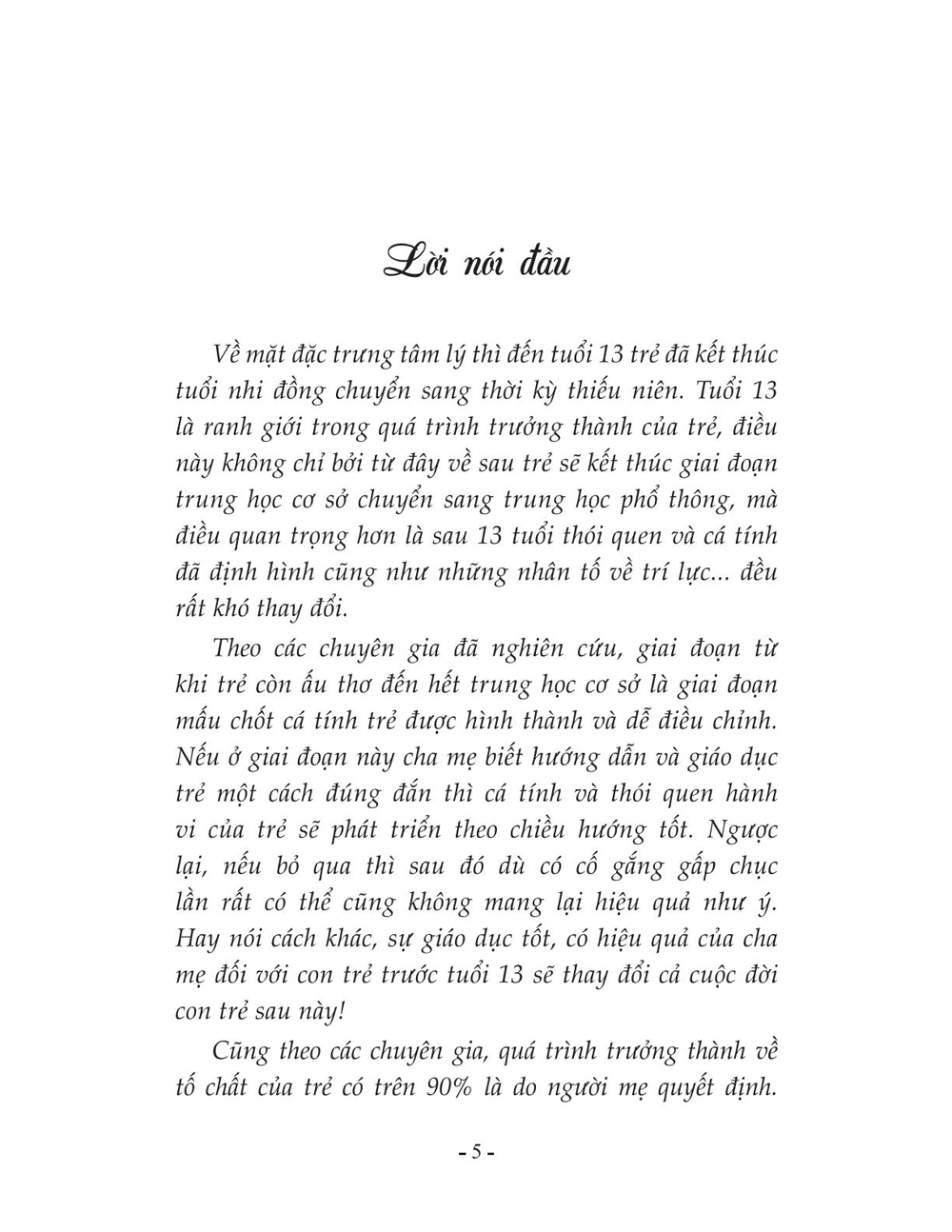 Mua tại TiktokSách xoay quanh vấn đề phương pháp giáo dục; đề cập thới những phương diện như tâm lý, thói quen, cá tính, sinh hoạt, học tập…ở trẻ trước tuổi 13, nhằm giúp các bậc phụ huynh có được những kinh nghiệm nhất định, từ đó tạo dựng nên một tương lai tốt đẹp cho con mình: những kiến thức tâm lý của trẻ người mẹ cần phải biết; những thói quen xấu của trẻ cần phải được điều chỉnh ngay; 12 cá tính lớn mà các bà mẹ thông minh cần phải tạo dựng cho con trẻ; không ai có thể thay thế được vai trò của người mẹ đối với con trẻ trước tuổi 13.