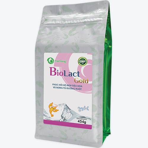 Sự kết hợp của vi sinh sống và nấm men sống. Một xu hướng của sự bền vững, mang lại những công dụng bổ trợ cho nhau trong việc làm tốt sức khỏe đường ruột cho tôm. Cung cấp các vi sinh và nấm men có lợi giúp tôm tiêu hóa và hấp thụ thức ăn tốt, giảm hao hụt thức ăn. Ngăn ngừa và hỗ trợ điều trị phân lỏng, ruột đứt khúc, phân trắng. Bổ sung hệ vi sinh có lợi trong đường ruột, tạo lập lợi thế cạnh tranh để hạn chế tối đa sự xâm nhập của những mầm bệnh gây hại trong đường ruột. MÔ TẢ: BIOLACT GOLD cung cấp vi sinh vật sống là tác động lên mô biểu bì của đường ruột giúp tăng cường liên kết các tế bào biểu mô và làm giảm các chất bài tiết do vi khuẩn tạo ra, các phân tử phòng vệ như chất nhầy. Cạnh tranh chất dinh dưỡng với vi khuẩn và trí bám dính của thành ruột. Tăng cường miễn dịch thông qua phản ứng kháng viêm và các bệnh đường ruột trên tôm. Hoạt tính vi sinh có lợi có trong sản phẩm dựa trên khả năng liên kết cộng sinh với niêm mạc ruột tạo ra những ảnh hưởng trực tiếp với tế bào ruột và thay đổi môi trường hệ niêm mạc theo hướng có lợi. Vi sinh có lợi liên kết cộng sinh với tế bào ruột của tôm, tạo nên liên kết tế bào với tế bào và điều chỉnh môi trường trong hệ niêm mạc có lợi cho hiệu quả vi sinh rõ nhất. Nấm men sống (sinh Lactic) tạo các phản ứng hoạt hóa để biến đổi các hoạt chất sinh học trong thức ăn và phục hồi hệ men một cách nhanh chóng. Nấm men có trong BIOLACT GOLD có thể tổng hợp ra các sản phẩm kháng khuẩn như Acid lactic, các enzym tiêu hóa, các Acid amin và các Vitamin nhóm B là những chất kìm hãm sự tăng sinh đối với các vi khuẩn gây bệnh. BIOLACT GOLD kích thích tiêu hóa, hấp thụ dinh dưỡng, làm tăng cường sức khỏe đường ruột. Giảm thiểu nguy cơ tỷ lệ mắc bệnh đường ruột, phân lỏng, phân trắng.
