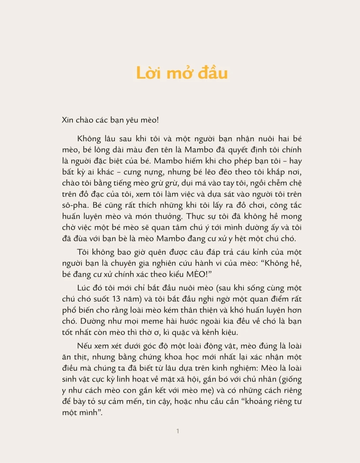 Với những tài liệu khoa học đầy thú vị cùng kinh nghiệm thực tiễn khi gắn bó với hai chú mèo cưng Mambo & Shimmy, tác giả Lili Chin khẳng định rằng: Mèo là loài sinh vật cực kỳ linh hoạt về mặt xã hội, gắn bó với chủ nhân (giống y như cách mèo con gắn kết với mèo mẹ) và có những cách riêng để bày tỏ sự cảm mến, tin cậy, hoặc nhu cầu cần “khoảng riêng tư một mình.”