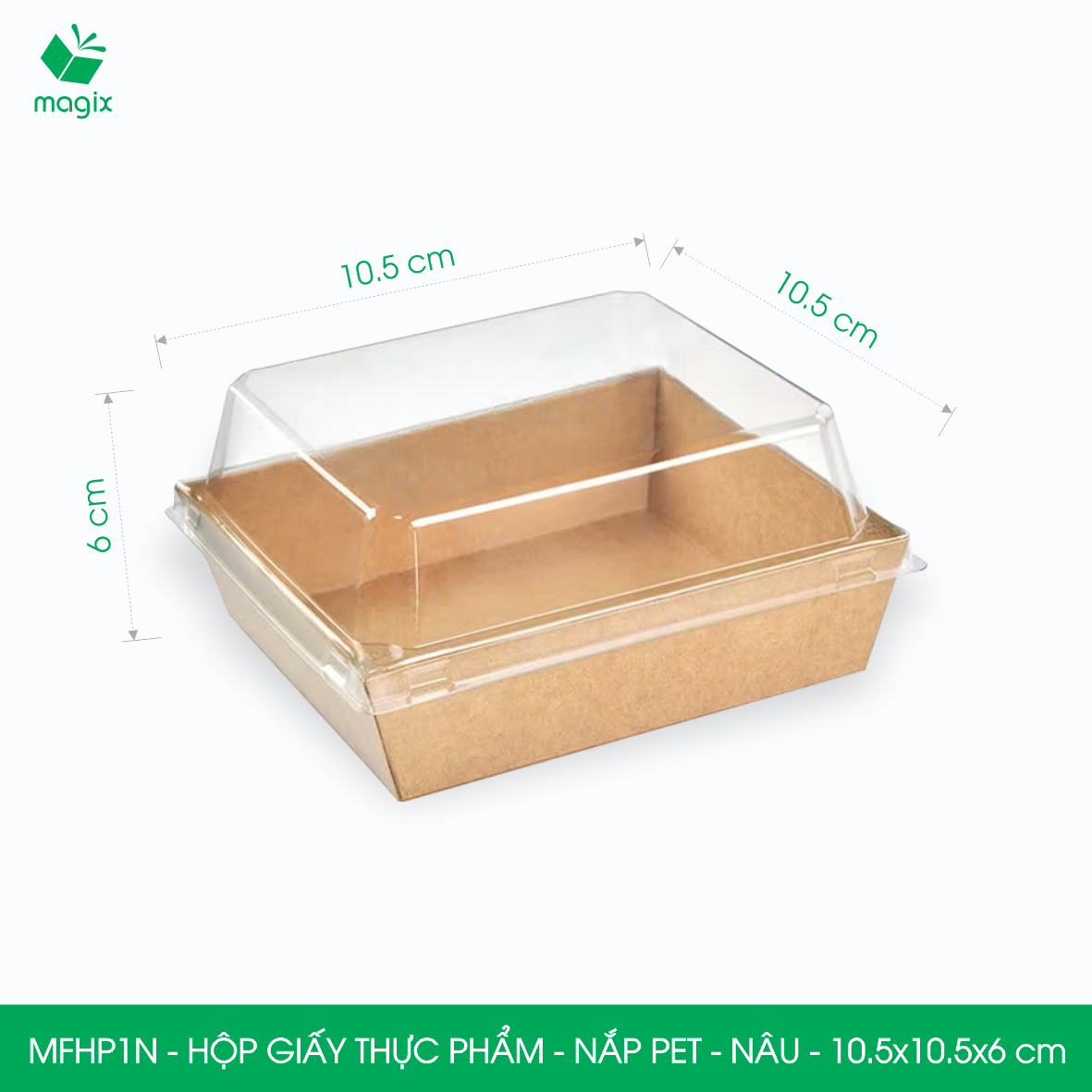 ✨MFHP1N - 10.5x10.5x6 cm - 50 hộp giấy kraft thực phẩm màu nâu nắp Pet, hộp giấy vuông đựng thức ăn, hộp bánh nắp trong