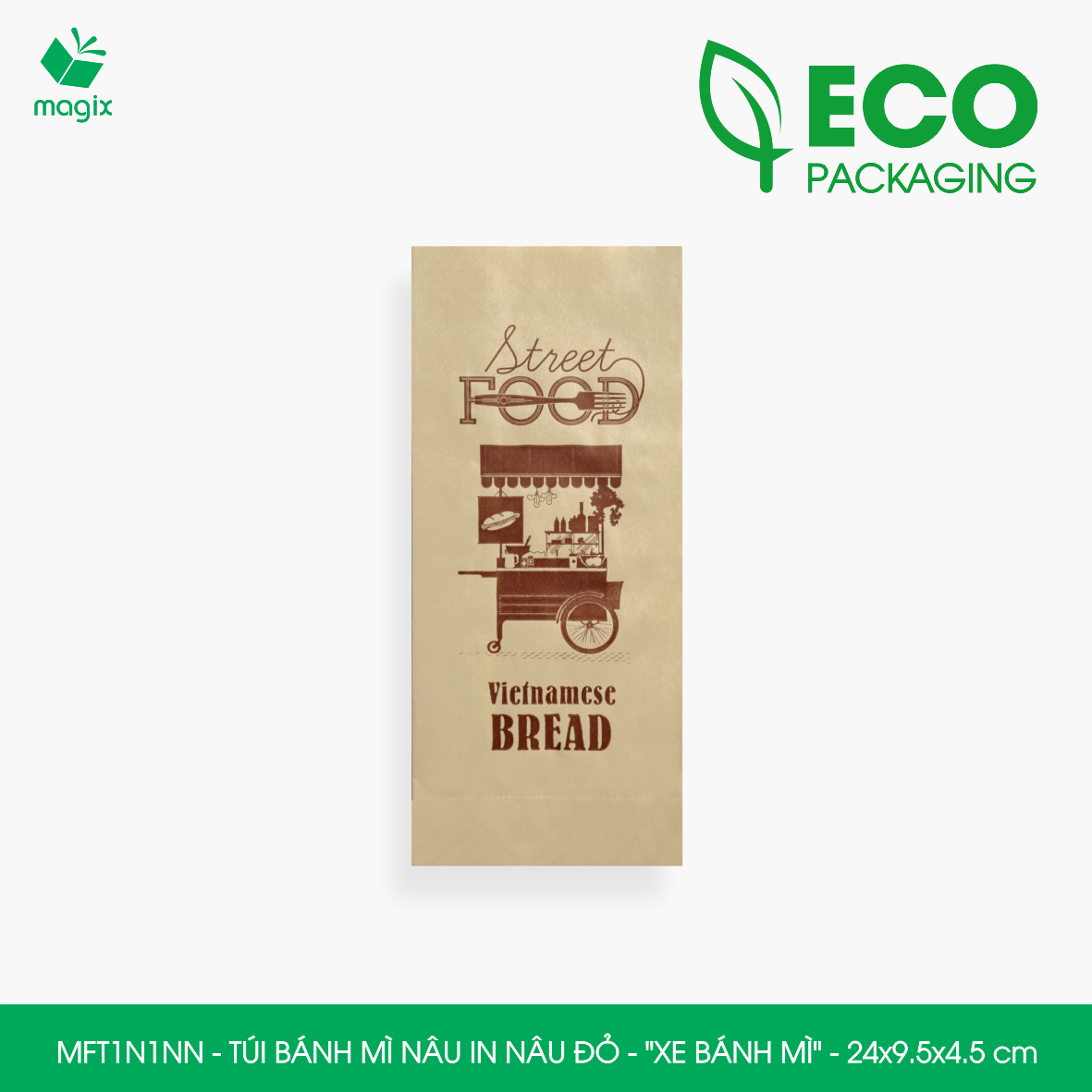 ĐẶC ĐIỂM SẢN PHẨM Chất liệu: Túi bánh mì in thường được làm từ giấy kraft nhật định lượng 50gsm thấm dầu có giấy chứng nhận FDA đảm bảo vệ sinh an toàn thực phầm Thiết kế: Miệng túi thiết kế chia thành 2 lớp dễ dàng thao tác bỏ bánh mì vào túi, đơn giản và tiện dụng    CÔNG DỤNG Tiện lợi: Bảo vệ bánh mì khỏi bụi bẩn, môi trường ô nhiễm, tác động từ bên ngoài và tránh làm dơ tay khi sử dụng Quảng cáo thương hiệu: Túi bánh mì in được sử dụng như một phương tiện quảng cáo nhỏ gọn và hiệu quả, với thiết kế in ấn logo, thông tin về sản phẩm và các thông điệp quảng cáo khác Bảo vệ môi trường: Túi bánh mì được làm từ chất liệu giấy kraft nguyên sinh, giúp giảm thiểu lượng rác thải nhựa và bảo vệ môi trường Tiết kiệm chi phí: Túi giấy bánh mì có giá thành thấp hơn so với các loại bao bì khác như hộp giấy, hộp nhựa đựng bánh mì   TIÊU CHUẨN KỸ THUẬT Chất liệu: Giấy Kraft chuyên dùng cho thực phẩm đạt tiêu chuẩn FDA  Định lượng: 50gsm Mã hàng - Kiểu in - Kích thước  • MFT1N5NN - Túi bánh mì nâu in nâu - "Giỏ bánh mì" - 24x9.5x4.5 cm  • MFT1T5N - Túi bánh mì trắng in nâu - "Giỏ bánh mì" - 24x9.5x4.5 cm  • MFT1N4X - Túi bánh mì nâu in xanh lá - "Best street food" - 24x9.5x4.5 cm  • MFT1T4X - Túi bánh mì trắng in xanh lá - "Best street food" - 24x9.5x4.5 cm  • MFT1N4NN - Túi bánh mì nâu in nâu đỏ - "Best street food" - 24x9.5x4.5 cm  • MFT1T4N - Túi bánh mì trắng in nâu - "Best street food" - 24x9.5x4.5 cm  • MFT1T3C - Túi bánh mì trắng in cam - "Đầu bếp" - 24x9.5x4.5 cm  • MFT1N3NN - Túi bánh mì nâu in nâu đỏ - "Đầu bếp" - 24x9.5x4.5 cm  • MFT1T3NN - Túi bánh mì trắng in nâu đỏ - "Đầu bếp" - 24x9.5x4.5 cm  • MFT1N2NN - Túi bánh mì nâu in nâu đỏ - "Cối xay gió" - 24x9.5x4.5 cm  • MFT1T2N - Túi bánh mì trắng in nâu - "Cối xay gió" - 24x9.5x4.5 cm  • MFT1N1NN - Túi bánh mì nâu in nâu đỏ - "Xe bánh mì" - 24x9.5x4.5 cm  • MFT1T1N - Túi bánh mì trắng in nâu - "Xe bánh mì" - 24x9.5x4.5 cm   LƯU Ý Bảo quản sản phẩm nơi khô ráo, sạch sẽ tránh tiếp xúc trực tiếp với ánh nắng mặt trời và nhiệt độ cao.