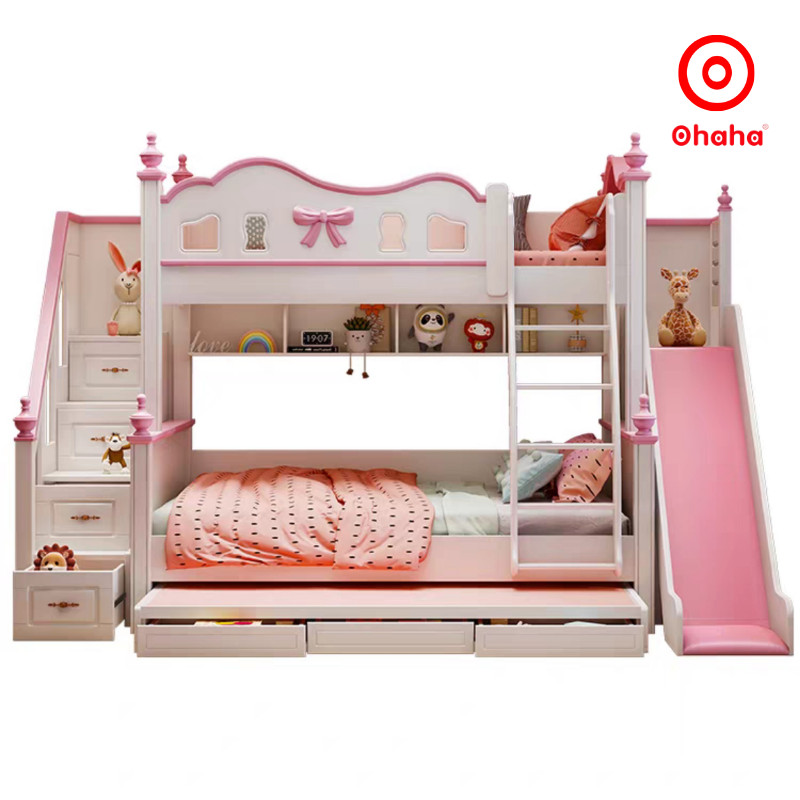 Giường tầng thông minh cao cấp Ohaha 3 tầng có cầu trượt - GTCC032 là mẫu giường tầng cao cấp được rất nhiều khách hàng yêu thích bởi thiết kế mang phong cách ngọt ngào tích hợp cùng nhiều tính năng thông minh như hộc cầu thang, giường phụ, cầu trượt, tủ áo,