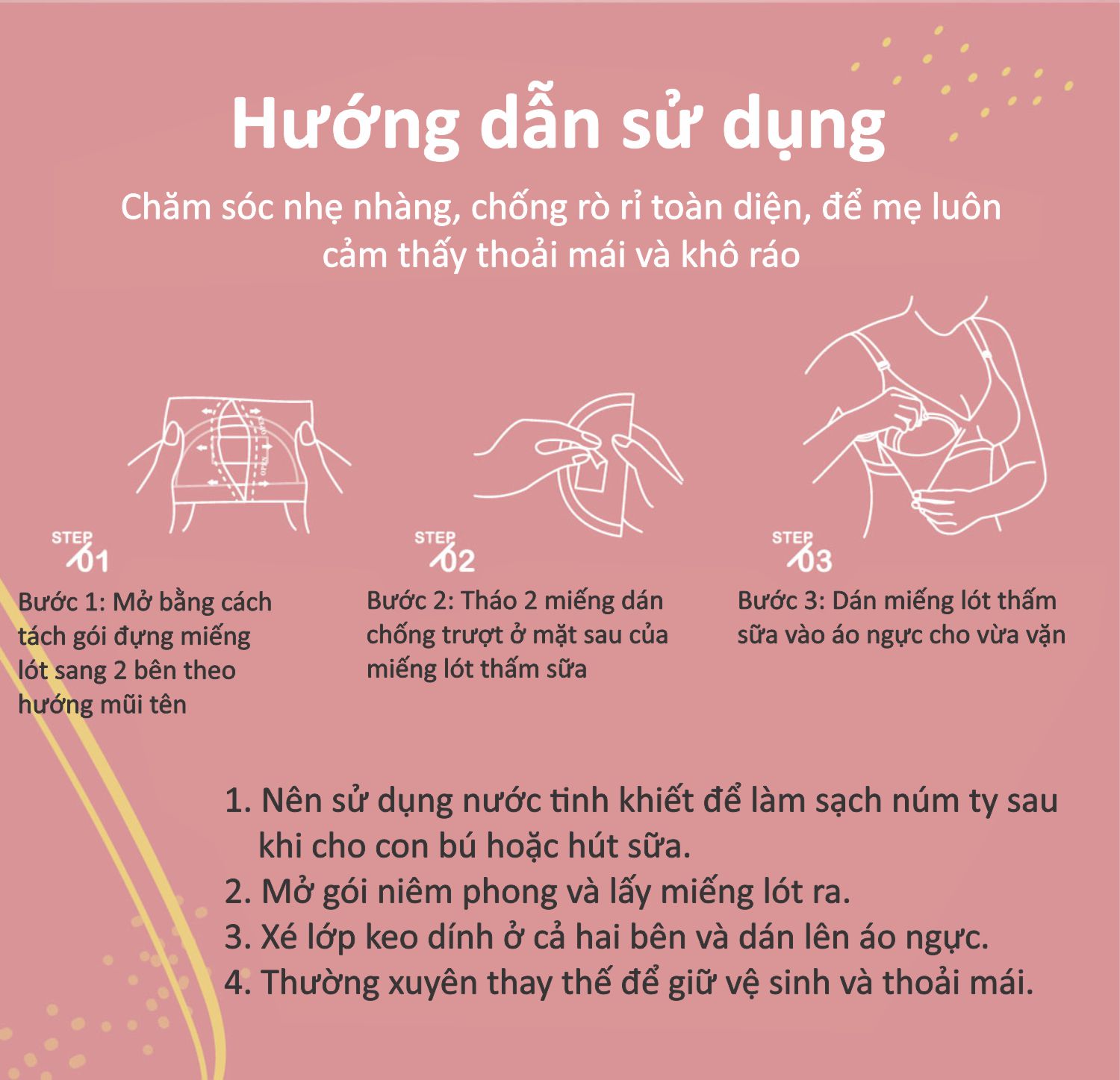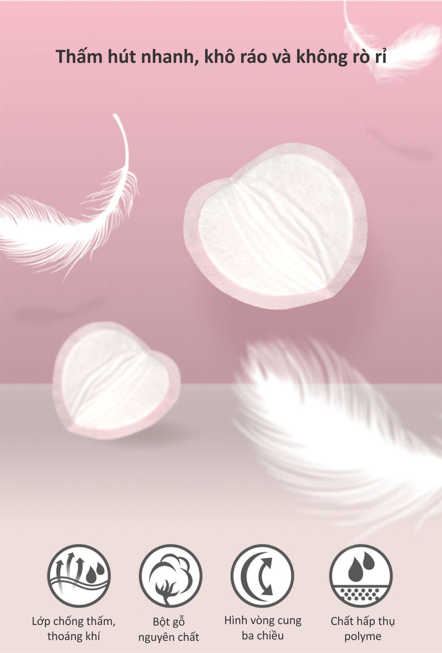 - Thấm hút tức thì lên đến 150ml sữa và chống thấm ngược trở lại; - Siêu mỏng chỉ 0,07cm, liền mạch, ôm sát ; - Co giãn 3 chiều, dễ điều chỉnh để vừa