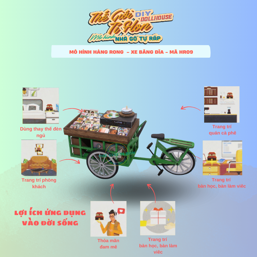 - SẢN PHẨM KHÔNG ÁP DỤNG ĐỔI TÊN BẢNG HIỆU GIÁ SẢN PHẨM CHƯA BAO GỒM THUẾ VAT, KHÁCH CẦN XUẤT VAT XIN VUI LÒNG LIÊN HỆ THẾ GIỚI TÍ HON QUA CHATBOX Mô Hình Sài Gòn Xưa Và Nay Thu Nhỏ - Xe Bán Đĩa Dạo - HR09 ** ĐƠN HÀNG XE HÀNG RONG KHÔNG ÁP DỤNG FREESHIP Cái thời internet còn chưa phát triển, muốn xem một bộ phim hay nghe nhạc… nhanh và sớm nhất chỉ còn cách mua đĩa thôi, thế là ở đất Sài Gòn thời ấy lại rộ lên một nghề mới – Bán đĩa dạo. Trên chiếc xe ba gác nhỏ đầy kín những đĩa nhạc đủ loại cũ mới và những phim hot hit thời đó, cùng với cái thùng loa nhỏ, cái đầu đĩa mini, vậy là đã đủ xịn xò để rong ruổi mưu sinh khắp phố phường Sài Gòn. Mô hình Xe Bán Đĩa Dạo Sài Gòn Thu Nhỏ - HR09 Tìm Hiểu Mô Hình Tí Hon Thông số mô hình Đánh giá độ khó Kích thước sản phẩm 12.0 x 4.0 x 6.0 CM (Dài x Rộng x Cao) Xuất xứ VIỆT NAM Cân nặng 0.2 Kg Nguyên vật liệu Gỗ, hoa cỏ khô, vải, giấy, kim loại, đèn Led, gốm sứ,nhựa,... Sản phẩm bao gồm Hộp Pin có công tắt, nguyên vật liệu lắp ráp, sách hướng dẫn. Phụ kiện làm mô hình (Mua riêng): Keo chuyên dụng + Mica Che Bụi + Bộ dụng cụ Kit...() Shop hỗ trợ lắp ráp luôn nếu bạn có nhu cầu (có phụ phí)