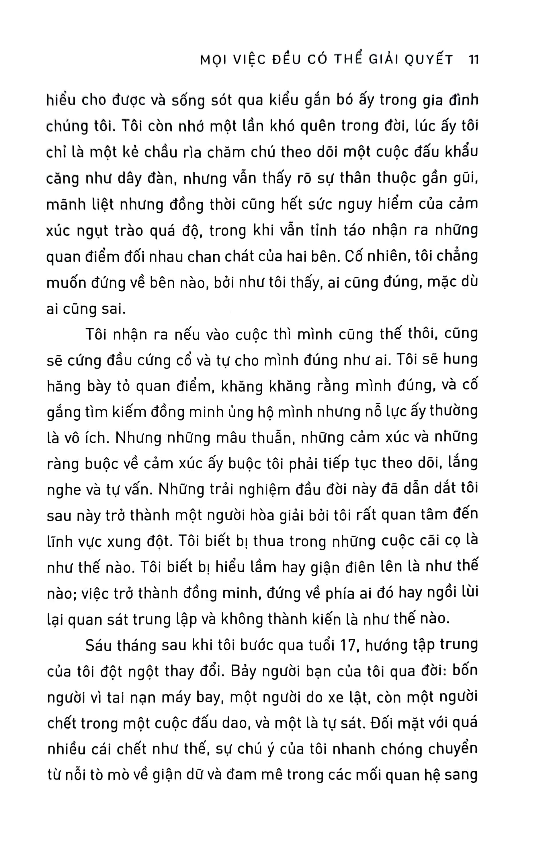 Cho dù những bất đồng, mâu thuẫn ấy có khó chịu đến đâu, đó vẫn là điều không thể tránh khỏi đối với trải nghiệm con người của chúng ta. Thay vì đối phó với nó trong tư thế đương đầu, ta sẽ học cách chung sống với nó và biến việc giải quyết xung đột thành một loại hình nghệ thuật, khiến ta trở nên kiên nhẫn hơn, sáng tạo hơn, chấp nhận những quan điểm đối lập, thấu hiểu mọi người xung quanh và chung sống hòa bình.