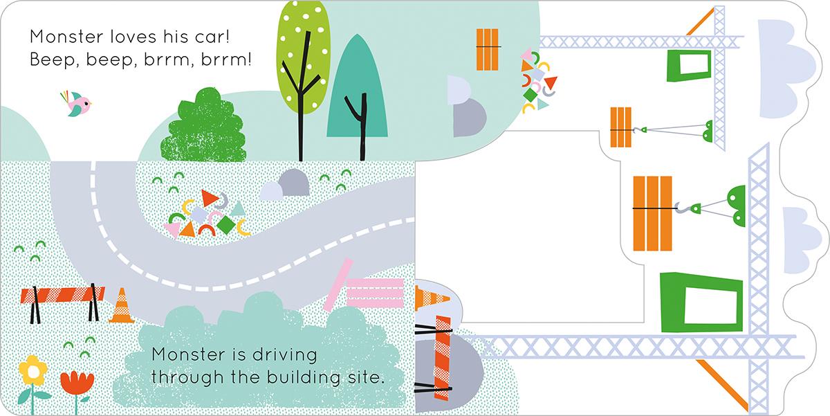 Monster loves dashing around in his car! Discover where monster is zooming off to in this interactive Push and Play title.