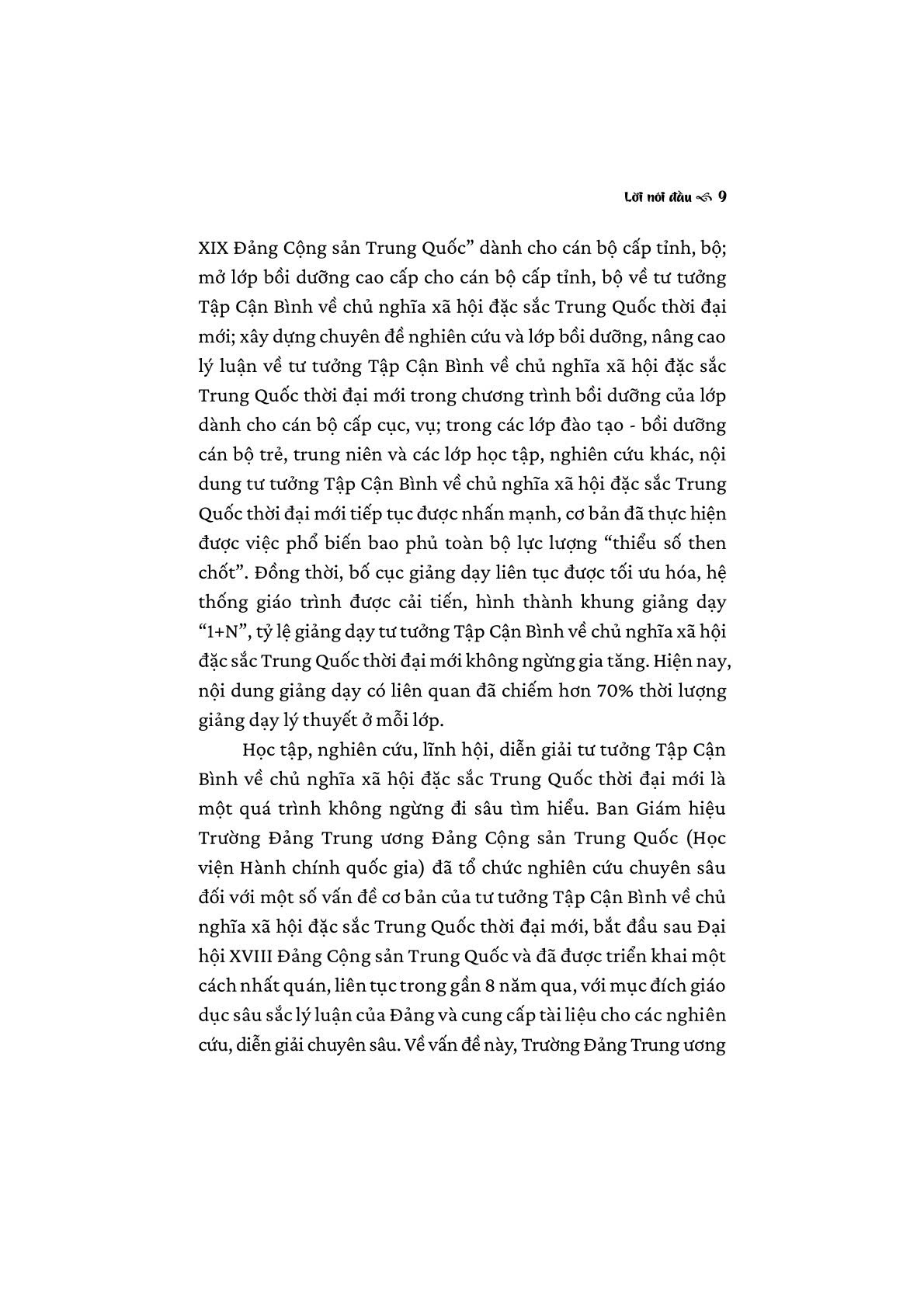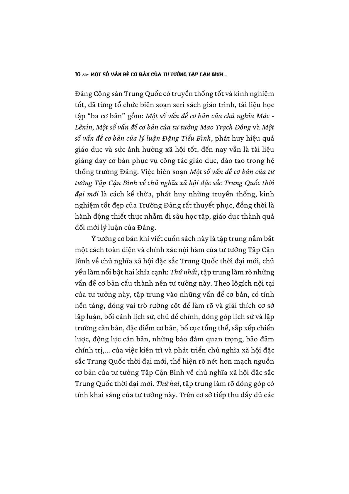 Để tìm hiểu rõ hơn những vấn đề, nội dung có liên quan trong tư tưởng Tập Cận Bình về chủ nghĩa xã hội đặc sắc Trung Quốc thời đại mới, Nhà xuất bản Chính trị quốc gia Sự thật tổ chức biên dịch, xuất bản cuốn sách Một số vấn đề cơ bản của tư tường Tập Cận Bình về chủ nghĩa xã hội đặc sắc Trung Quốc thời đại mới do Trường Đảng Trung ương Đảng Cộng sản Trung Quốc (Học viện Hành chính quốc gia) phối hợp với Nhà xuất bản Nhân dân, Trung Quốc xuất bản. Cuốn sách gồm phần Giới thiệu, 15 chương nội dung chính và Kết luận, tập trung phân tích những vấn đề về quan điểm lý luận, phương châm, sách lược... trong tư tưởng Tập Cận Bình về chủ nghĩa xã hội đặc sắc Trung Quốc thời đại mới, như: kiên trì và phát triển hơn nữa chủ nghĩa xã hội đặc sắc Trung Quốc; kiên trì lập trường căn bản lấy nhân dân làm trung tâm; quan điểm phát triển mới “sáng tạo, hài hòa, xanh, mở cửa, cùng chia sẻ”; kiên trì đi sâu cải cách toàn diện và mở cửa toàn diện; xây dựng Trung Quốc thành cường quốc hiện đại hóa xã hội chủ nghĩa giàu mạnh, dân chủ, văn minh, hài hòa, tươi đẹp; thực hiện Giấc mơ Trung Quốc phục hưng vĩ đại dân tộc Trung Hoa