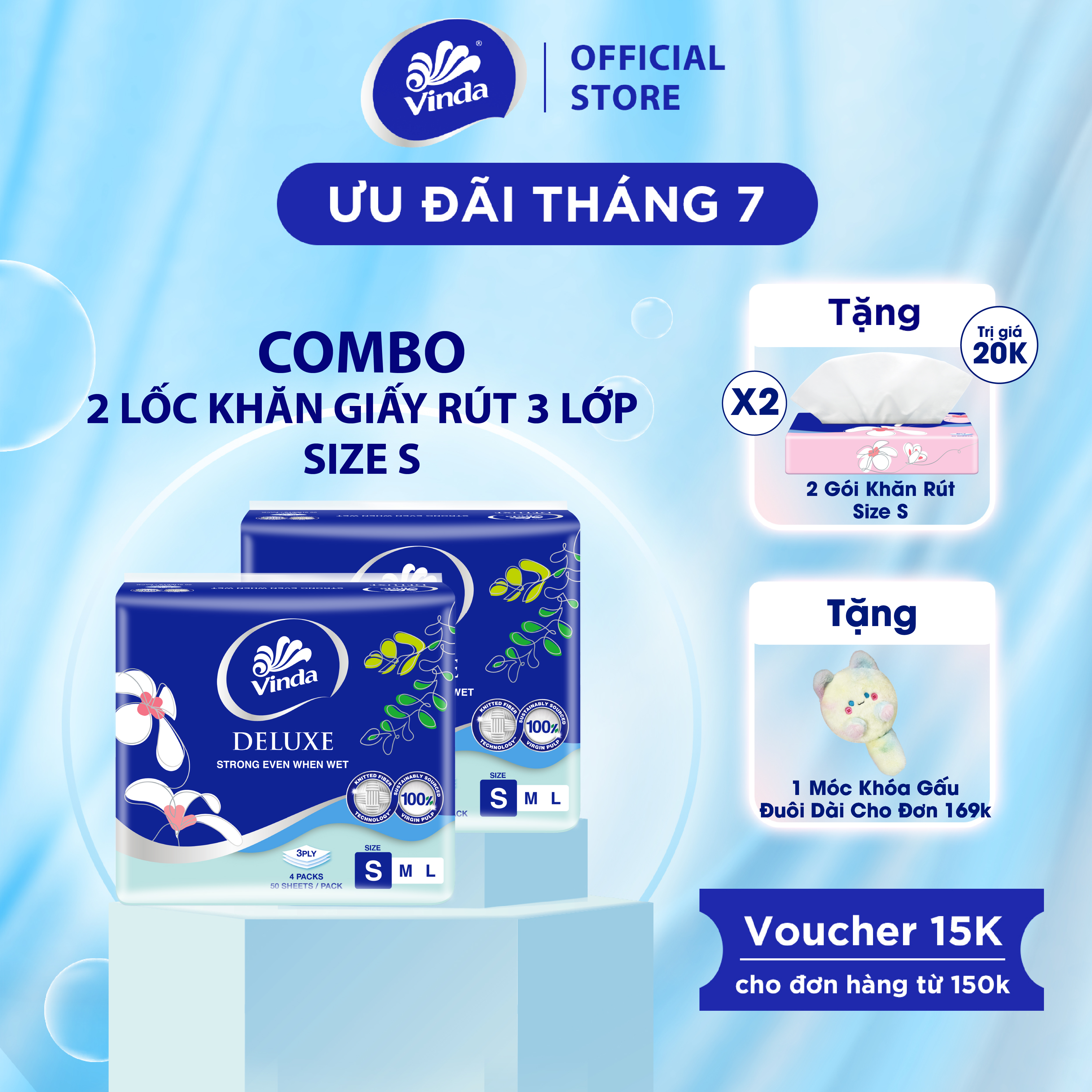 Câu chuyện thương hiệu:   Các gia đình Việt Nam đang ngày càng quan tâm sâu sắc hơn về các giải pháp chất lượng và an toàn dành cho toàn bộ mọi người trong gia đình đặc biệt là trẻ nhỏ. Họ mong muốn sản phẩm không chỉ hiệu quả mà còn mang đến chất lượng thoải mái để họ có thể yên tâm về sức khỏe cũng như sự an toàn cho các thành viên trong gia đình. Vinda thấu hiểu sâu sắc và luôn nỗ lực để đáp ứng yêu cầu thích đáng của khách hàng.  Vinda mong muốn trở thành một phần không thể thiếu trong các hoạt động thường nhật của gia đình bạn. Khăn giấy Vinda sẽ mang đến sự hiệu quả cũng giống như sự bền dai vượt trội ngay cả khi ướt thông qua công nghệ Knitted Fiber chuyên biệt, qua đó, để các gia đình luôn cảm giác an tâm và thoải mái trong mọi khoảnh khắc.   Giới thiệu sản phẩm:   Khăn giấy rút Vinda được làm từ bột giấy nguyên chất, không chứa hóa chất tẩy trắng độc hại, an toàn cho sức khỏe người dùng. Sản phẩm Vinda bền dai ngay cả khi ướt, không để lại vụn giấy khi sử dụng Thiết kế dạng rút tiện lợi giúp lấy giấy dễ dàng, hợp vệ sinh, phù hợp sử dụng trong gia đình, văn phòng, nhà hàng, trường học hoặc mang theo khi di chuyển. Phù hợp lý tưởng để vệ sinh cá nhân như lau tay, lau mặt, hoặc vệ sinh vật dụng cá nhân, bàn ăn hay các bề mặt khác. Ngoài ra, sản phẩm cũng thích hợp dùng trong các bữa ăn, đảm bảo an toàn thực phẩm và mang lại cảm giác sạch sẽ, dễ chịu.   Hạn sử dụng và quy cách: Hạn sử dụng: 3 năm kể từ ngày sản xuất. Ngày sản xuất: in trên gói theo năm/tháng/ngày   Quy cách:  Khăn giấy rút cao cấp Vinda Deluxe Size S Số lượng: 50 tờ 1 gói Số lớp: 3 lớp/ tờ Định lượng của 1 lớp giấy: 14 ± 1,0 gsm Kích thước: (140mm x 195mm) ± 5 mm Thành phần: 100% Bột giấy nguyên thủy. Bảo quản: Để nơi thoáng mát và tránh ánh nắng mặt trời