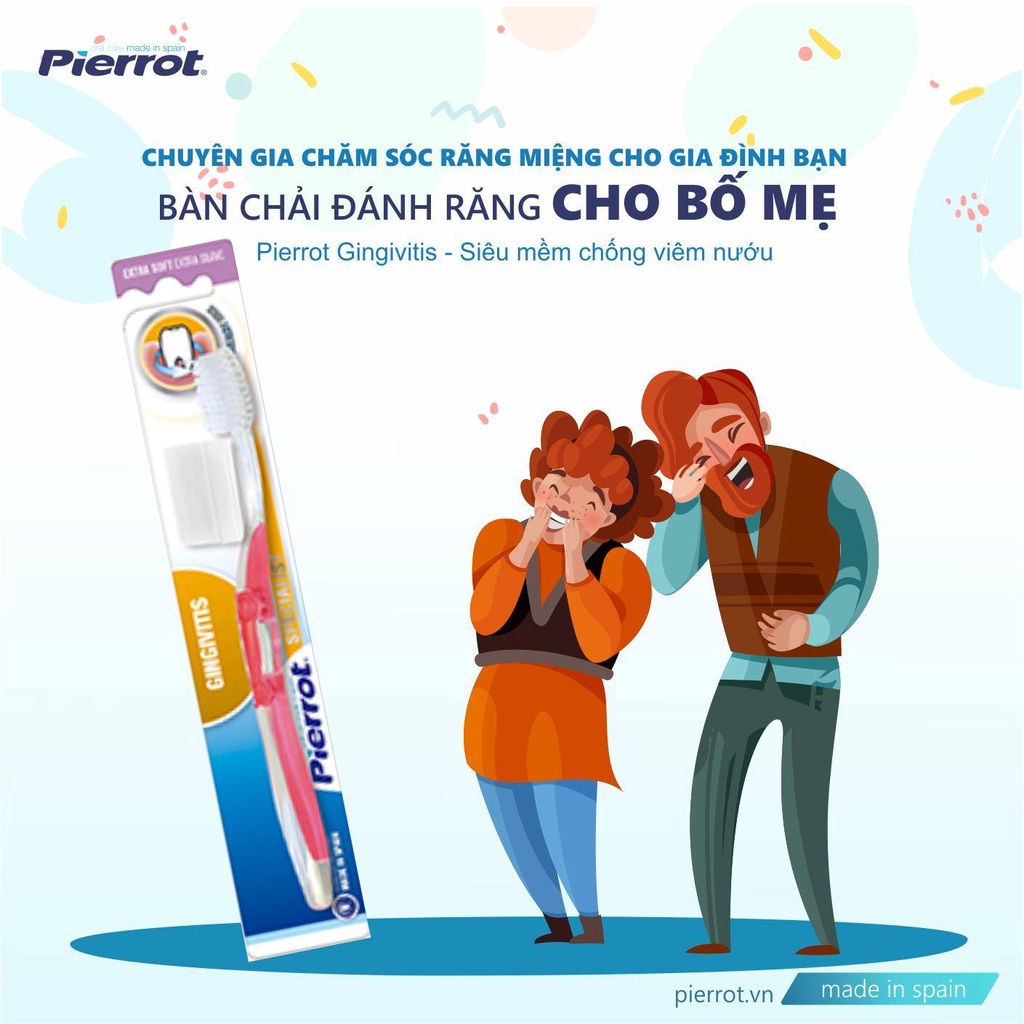 - Bàn chải đánh răng siêu mềm chống viêm nướu PIERROT GINGIVITIS giúp chải sạch răng và nướu một cách nhẹ nhàng nhờ cấu tạo lông bàn chải mềm mảnh.