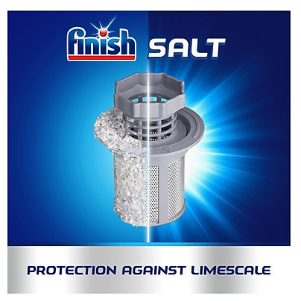 - Finish – thương hiệu rửa chén tự động được khuyên dùng bởi hầu hết các hãng máy rửa chén trên toàn thế giới. FINISH – EVERYDAY – EVERY LOVE Muối rửa chén Finish Dishwasher Salt giúp làm mềm nước trong máy rửa chén của bạn. Nước máy thông thường chứa nhiều canxi, magie sẽ gây lên sự tích tụ cặn vôi trong máy rửa chén, đồng thời làm giảm tính năng của viên rửa chén, gây tắc vòi phun nước, ống dẫn và đặc biệt tạo ra các mảng bám trên chén đĩa, các đồ sành sứ, thủy tinh, inox và các dụng cụ nhà bếp của bạn. Hãy để Muối rửa chén Finish Dishwasher Salt là sự lựa chọn hoàn hảo, cần thiết để đảm bảo rằng máy rửa chén luôn hoạt động ở mức hiệu suất tối ưu và chén, đĩa, dụng cụ nhà bếp luôn trông như mới.