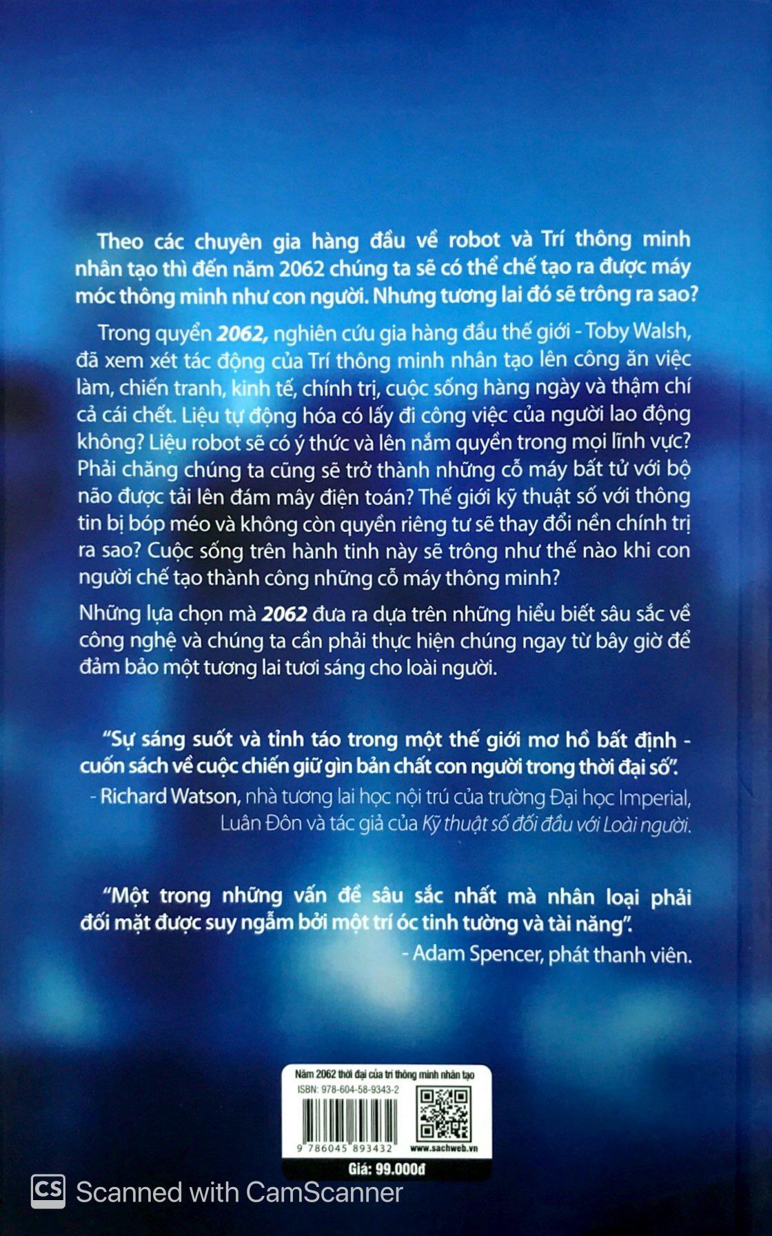 Trong quyển “2062”, Nghiên cứu gia hàng đầu thế giới- Toby Walsh, đã xem xét tác động của Trí thông minh nhân tạo lên công ăn việc làm, chiến tranh, kinh tế, chính trị, cuộc sống hàng ngày và thậm chí cả cái chết. Liệu tự động hóa có lấy đi công việc của người lao động không? Liệu robot sẽ có ý thức và lên nắm quyền trong mọi lĩnh vực? Phải chăng chúng ta cũng sẽ trở thành những cỗ máy bất tử với bộ não được tải lên đám mây điện toán? Thế giới kỹ thuật số với thông tin bị bóp méo và không còn quyền riêng tư sẽ thay đổi nền chính trị ra sao? Cuộc sống trên hành tinh này sẽ trông như thế nào khi con người chế tạo thành công những cỗ máy thông minh?