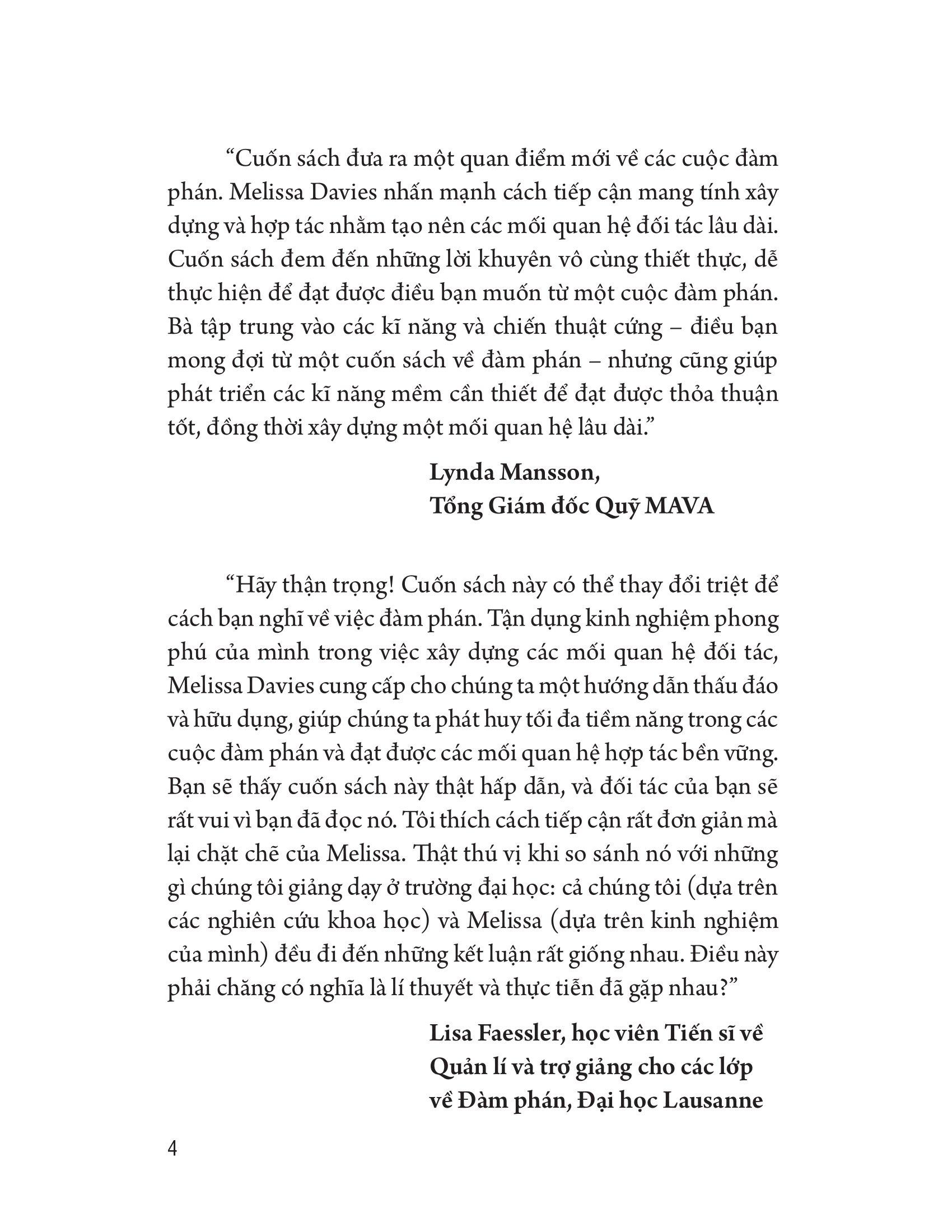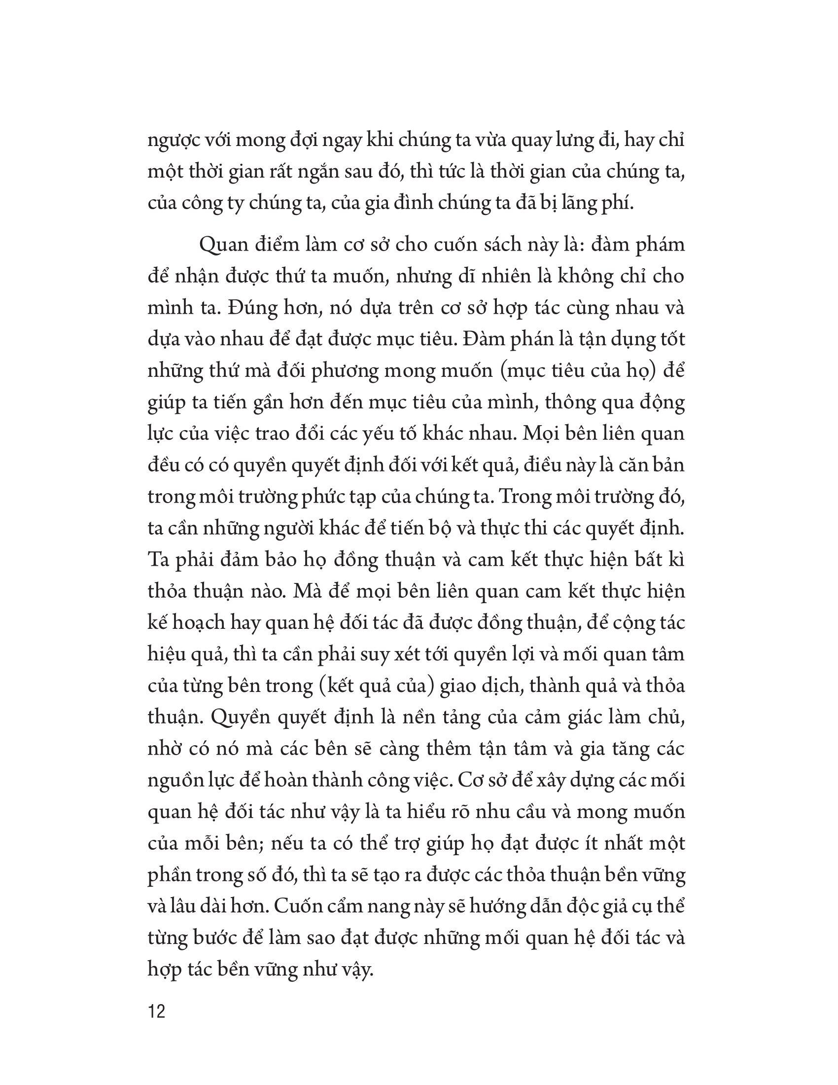Quan điểm làm cơ sở trong cuốn sách này là: ĐÀM PHÁN để nhận được thứ ta muốn, nhưng dĩ nhiên là không chỉ cho m.ình ta. Đúng hơn, nó dựa trên cơ sở hợp tác cùng nhau và dựa vào nhau để đạt được mục tiêu.