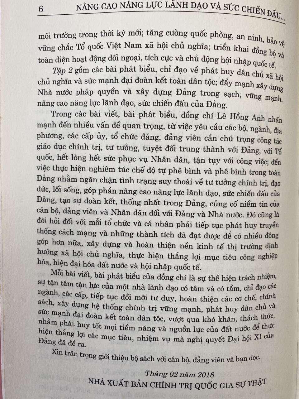 Bộ sách tuyển chọn các bài phát biểu, bài viết của đồng chí Lê Hồng Anh về nhiều lĩnh vực trên cương vị là Ủy viên Bộ Chính trị, Thường trực Ban Bí thư Trung ương Đảng khóa XI. Tập 1 gồm các bài phát biểu, chỉ đạo thực hiện nhiệm vụ phát triển kinh tế, đẩy mạnh công nghiệp hóa, hiện đại hóa đất nước; phát triển văn hóa – xã hội, giáo dục và đào tạo, khoa học và công nghệ, bảo vệ môi trường trong thời kỳ mới; tăng cường quốc phòng, an ninh, bảo vệ vững chắc Tổ quốc Việt Nam xã hội chủ nghĩa; triển khai đồng bộ và toàn diện hoạt động đối ngoại, tích cực và chủ động hội nhập quốc tế.