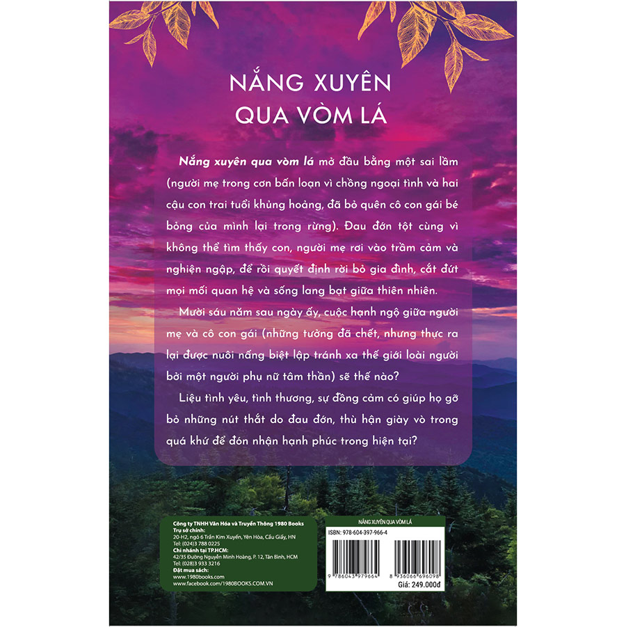 Sau Nơi khu rừng chạm tới những vì sao, Glendy Vanderah (tác giả sách bán chạy theo bình chọn của Wall Street Journal) đã tiếp nối những cảm xúc thứ tha và chữa lành ấy bằng một cuốn tiểu thuyết tuyệt diệu về tình yêu, sự mất mát và hành trình khám phá bản thân, The light through the leaves.