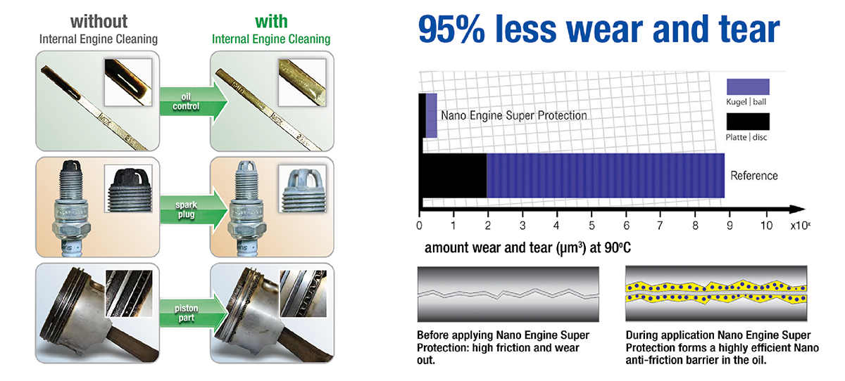 Tính năng: Tăng độ bôi trơn của nhớt cũ lên trên tới 96%. (Đã được kiểm chứng bởi TUV). Trung hòa các acid có hại cho động cơ. Làm sạch và giúp van thủy lực