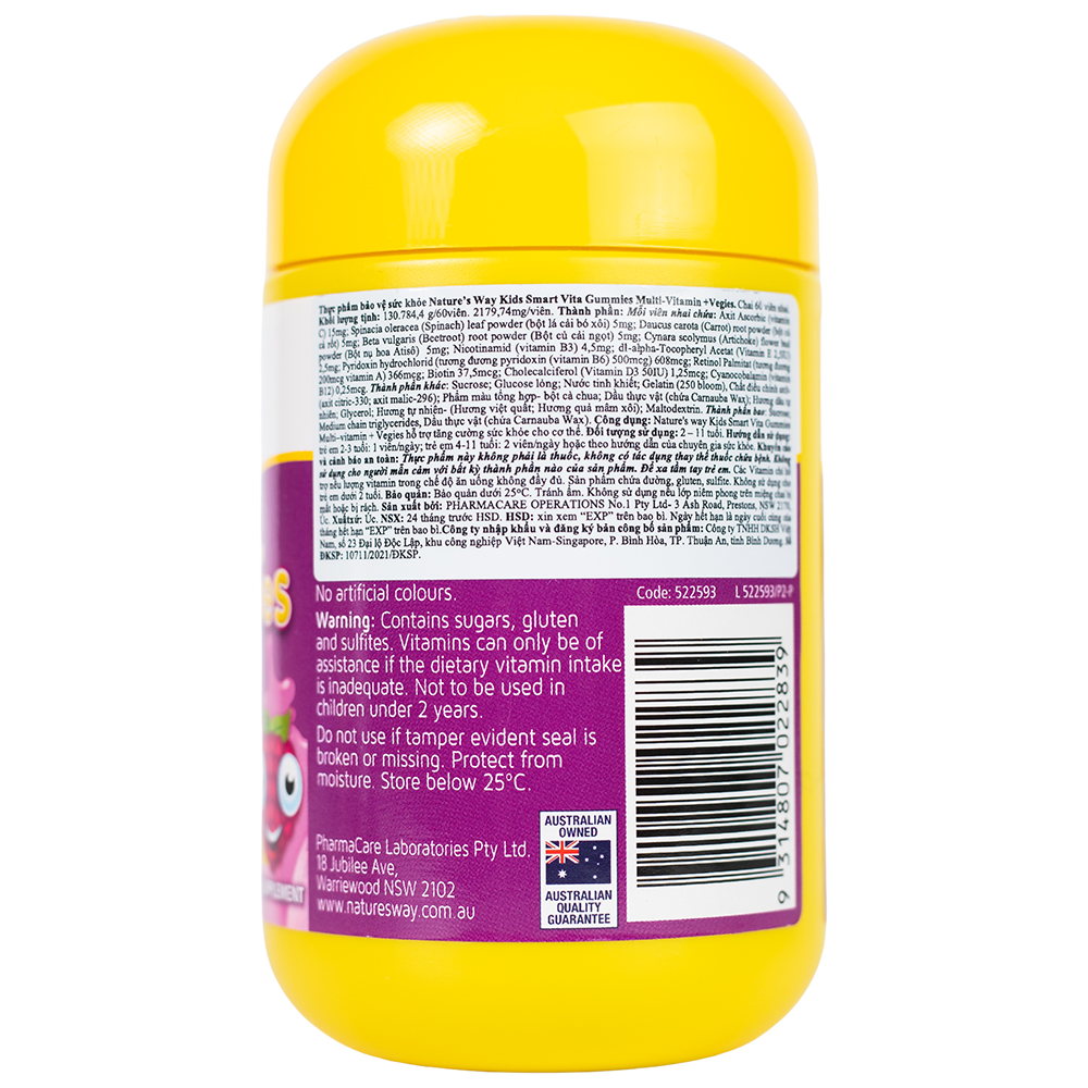 Nature's Way Kids Smart VITA GUMMIES ( VITAMIN/ VEGIES) - Vitamin Tổng Hợp (60 viên/ Lọ) Giới thiệu Nature's Way Kids Smart VITA GUMMIES là sản phẩm kẹo dẻo bổ sung vitamin và rau củ dành riêng cho trẻ em, được sản xuất bởi thương hiệu Nature's Way nổi tiếng. Sản phẩm này cung cấp một lượng lớn các vitamin và khoáng chất cần thiết cho sự phát triển toàn diện của trẻ. Thành phần Thành phần chính: Axit Ascorbic (vitamin C) 15mg; Nicotinamid (vitamin B3) 4,5mg; dl-alpha-Tocopheryl Acetate (Vitamin E 2,5IU) 2,5mg; Pyridoxin hydrochlorid (tương đương pyridoxin (vitamin B6) 500mcg) 608mcg; Retinol Palmitat (tương đương 200mcg vitamin A) 366mcg; Biotin (chứa Sucrose 3,713mg) 37,5mcg; Cyanocobalamin (vitamin B12) (chứa Sucrose 249,8mcg) 0,25mcg; Cholecalciferol (Vitamin D3) 1,25mcg; Spinacia oleracea (Spinach) leaf powder (bột lá cải bó xôi) 5mg; Daucus carota (Carrot) root powder (bột củ cà rốt) 5mg; Beta vulgaris (Beetroot) root powder (Bột củ cải ngọt) 5mg; Cynara scolymus (Artichoke) flower bud powder (Bột nụ hoa Atisô) (chứa Maltodextrin 550mcg) 5mg. Phụ liệu: Glucose lỏng; Sucrose; Nước tinh khiết; Gelatin 250 bloom; Chất điều chỉnh độ axit (Axit citric-330); Dầu dừa phân đoạn; Chất điều chỉnh độ axit (Axit malic-296), Chất tạo màu tự nhiên - bột cà chua; Hương liệu tổng hợp (vị dâu; vị việt quất; vị quả mâm xôi). Đặc điểm nổi bật Kids Smart Vita Gummies Multivitamin Vegies Nature's Way là giải pháp giúp bé cân bằng dinh dưỡng bên cạnh bữa ăn hằng ngày. Sản phẩm bổ sung các loại vitamin A, C, D3, E, vitamin nhóm B (B3, B6, B7), thêm một số rau củ dạng bột (cà rốt, cải bó xôi, củ cải ngọt, bột nụ hoa atiso) mang nhiều nguyên tố vi lượng và chất xơ giúp bù đắp lượng vitamin và các dưỡng chất bị thiếu hụt. Nhờ đó, trẻ ăn uống ngon miệng hơn, tăng trưởng và phát triển toàn diện hơn. Bổ sung vitamin và rau củ Kẹo dẻo Kids Smart Vita Gummies Multivitamin Vegies Nature's Way bổ sung dinh dưỡng ngoài bữa ăn hằng ngày với đủ lượng vitamin và khoáng chất từ thực phẩm, đặc biệt hỗ trợ: Tăng trưởng và phát triển lành mạnh; Duy trì chức năng não bộ; Bảo vệ thị lực mắt; Nâng cao hệ thống miễn dịch; Tăng cường hoạt động tiêu hóa. Viên dinh dưỡng dẻo thơm thú vị Có những bé tỏ ra khó chịu khi bị bố mẹ ép uống những viên nhộng hoặc viên thuốc cứng. Đây là lí do Kids Smart Vita Gummies Multivitamin Vegies Nature's Way được thiết kế dạng viên nhai dẻo mềm. Bên cạnh giúp trẻ cảm thấy ngon miệng và vui thú mỗi khi nhai kẹo, đây còn là cách để trẻ tập làm quen dần với việc nuốt một viên thuốc mà không cần đến một cuộc đấu tranh gay gắt khi bạn muốn bổ sung dinh dưỡng cho trẻ. Tất cả những dưỡng chất tự nhiên được gói trọn trong viên nhai hương vị quả mọng tự nhiên, chua chua ngọt ngọt làm bé thích thú thưởng thức và sẽ khiến trẻ nhớ đến việc uống vitamin mỗi ngày mà không cần bố mẹ nhắc nhở. Công dụng Bổ sung vitamin và chất dinh dưỡng từ rau củ quả. Hỗ trợ tăng trưởng và phát triển tối ưu cho bé.​ Hướng dẫn sử dụng Uống 1 viên/ngày hoặc theo chỉ dẫn của chuyên gia. Dành cho trẻ từ 4 tuổi trở lên Hướng dẫn bảo quản Bảo quản nơi khô ráo, thoáng mát, tránh ánh nắng trực tiếp. Để xa tầm tay trẻ em. Tiêu chuẩn an toàn Sản phẩm được sản xuất theo tiêu chuẩn GMP, đảm bảo chất lượng và an toàn. Lưu ý sử dụng Sản phẩm này không phải là thuốc và không có tác dụng thay thế thuốc chữa bệnh. Không dùng cho người mẫn cảm với bất kỳ thành phần nào của sản phẩm.   Nếu có bất kỳ dấu hiệu bất thường nào, hãy ngưng sử dụng và tham khảo ý kiến bác sĩ Khuyến cáo Để đạt hiệu quả tốt nhất, nên kết hợp sử dụng sản phẩm với chế độ ăn uống cân bằng, giàu chất xơ và uống đủ nước. Tham khảo ý kiến bác sĩ, dược sĩ trước khi sử dụng, đặc biệt đối với trẻ em có bệnh lý nền.
