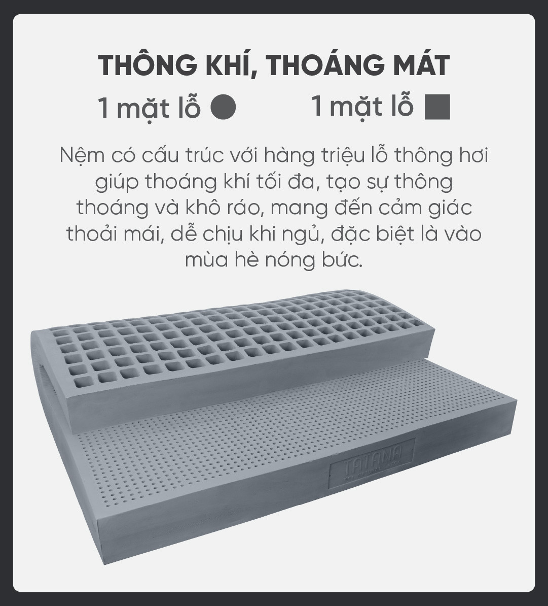- Thiết kế các lỗ thông hơi: Thiết kế với hai mặt có các lỗ thông hơi, bao gồm 1 mặt lỗ tròn và 1 mặt lỗ vuông. Các lỗ thông hơi này giúp nệm có khả năng thoáng khí tốt hơn, góp phần tạo cảm giác mát mẻ và thoải mái cho người sử dụng, đặc biệt là vào mùa hè