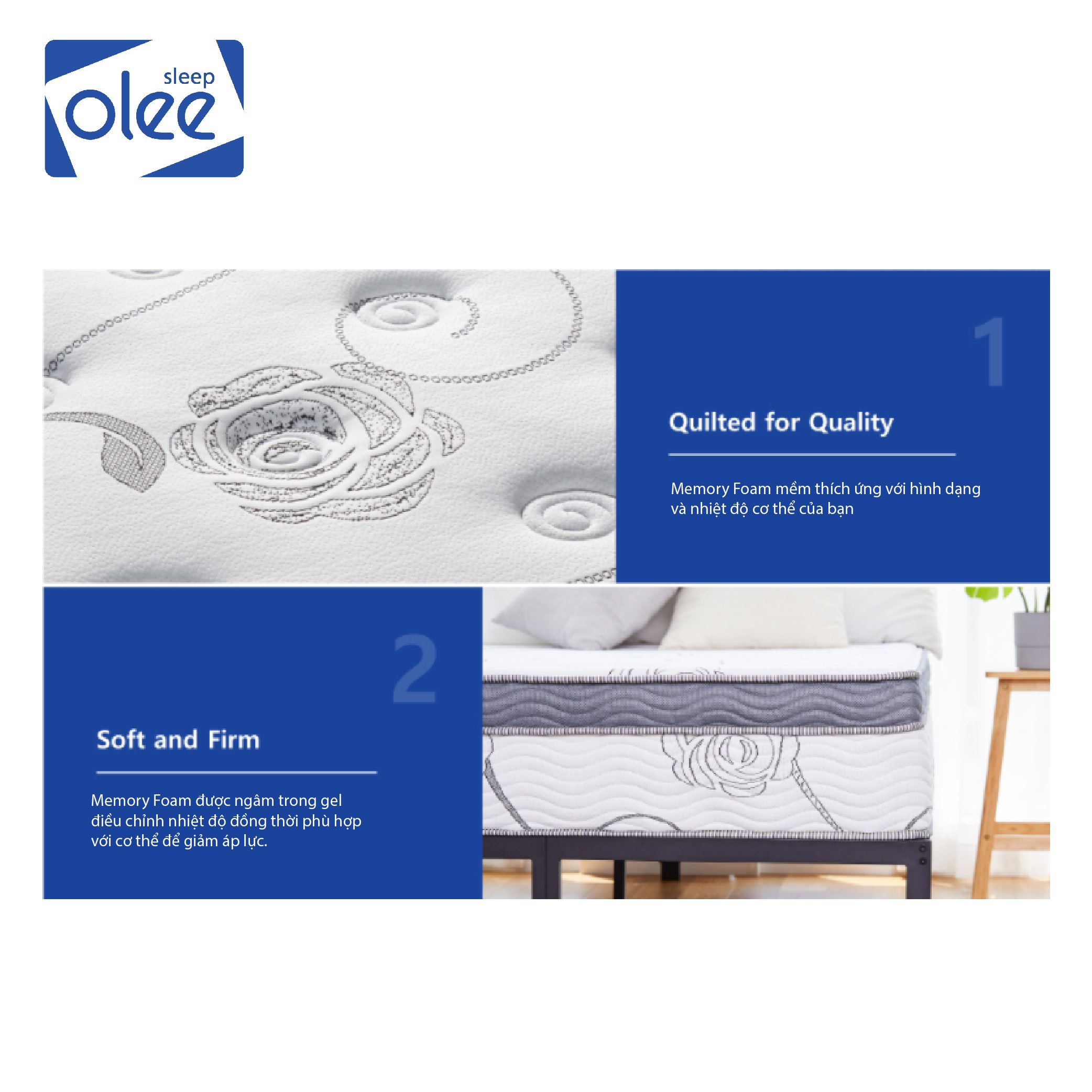 Nệm lò xo lai Omega Olee Sleep 10 inch -10SM02 : ● Bao gồm 5 lớp gồm lò xo túi ● Memory Foam mềm thích ứng với hình dạng và nhiệt độ cơ thể của