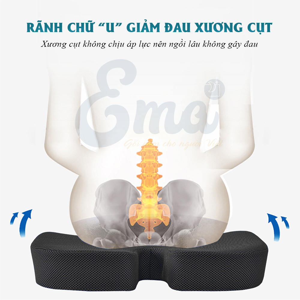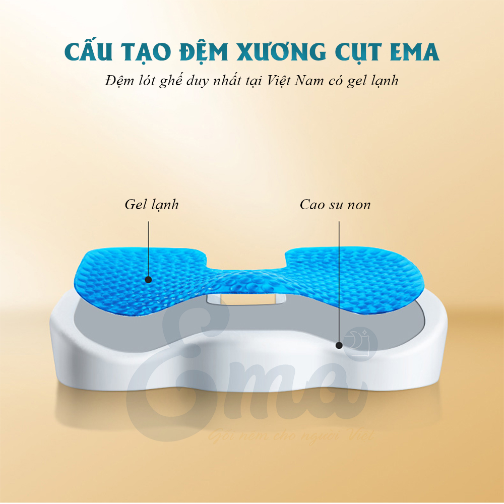 ĐỆM NGỒI CHỐNG ĐAU XƯƠNG CỤT EMA CHỐNG ĐAU XƯƠNG CỤT, Ê MÔNG, THÂM MÔNG, XỆ MÔNG NHƯ THẾ NÀO? Xương cụt là xương đáy tận cùng của hệ thống xương sống, đây là phần phải chịu toàn bộ áp lực của cơ thể khi ngồi. Việc ngồi quá lâu, trong một thời gian dài và trên một mặt phẳng cứng có thể gây nhiều áp lực lên xương cụt, dẫn đến đau mỏi xương cụt và các cơ, dây chằng xung quanh xương cụt. Những người đang bị bệnh đau xương cụt sẽ thấy tình trạng đau tăng lên nhiều khi ngồi. Khi được ngồi ở đệm xương cụt công thái học, phần xương cụt hầu như không còn phải chịu bất cứ một áp lực nào, thậm chí kể cả khi ngả ra đằng sau Ảnh minh họa: Phần xương cụt được "giải phóng" khi ngồi trên đệm ngồi Ema chuyên dụng Khi ngồi, phần chịu áp lực nhiều nhất là xương, cơ quanh ụ ngồi – phần nhô cao nhất của mông. Vì vùng xương ụ ngồi và các cơ xung quanh nó chịu nhiều áp lực nhất trong khi ngồi. Cho nên khi ngồi càng lâu, nhất là trên bề mặt cứng thì vùng này dễ thấy bị ê và thâm nhất. Không chỉ như vậy, theo nhiều chuyên gia về thẩm mỹ, ngồi lâu cũng khiến vòng 3 bị phẳng đi, chảy xệ, không còn giữ được độ cong.  Đệm xương cụt công thái học với thiết kế công thái học ôm theo đường cong của 2 bên mông và sử dụng chất liệu memory foam giúp giảm áp lực lên 2 vùng ụ ngồi. Ảnh minh họa: Đệm ngồi Ema giúp áp lực dàn đều, không tập trung vào ụ mông từ đó giảm ê, thâm và tăng cường lưu thông máu   ĐỐI TƯỢNG SỬ DỤNG ĐỆM NGỒI CHỐNG ĐAU XƯƠNG CỤT EMA Những người phải ngồi lâu, nhất là khi ngồi ghế cứng có thể dẫn đến vấn đề đau xương cụt, ê mông, thâm mông, xệ mông. Những người đang bị bệnh đau xương cụt như chấn thương, thoái hóa, phụ nữ mang thai. Những người đang ngồi làm việc trên một chiếc ghế dốc về đằng sau, ví dụ như ghế lái xe. Vì ghế ngả ra sau sẽ làm tăng áp lực ở vùng xương cụt khiến xương cụt dễ bị đau mỏi hơn khi ngồi lâu. THÔNG SỐ KỸ THUẬT ĐỆM NGỒI CHỐNG ĐAU XƯƠNG CỤT EMA Khối lượng: 1 kg Kích thước: 45x35x7cm Chất liệu: Ruột gối được làm từ memory foam giúp giảm tốt nhất áp lực lên vùng mông. Tạo cảm giác thoải mái cho người ngồi, nhất là những người phải ngồi làm việc lâu trong nhiều giờ. Ruột gối được thiết kế thêm 1 lớp gel trên bề mặt tạo sự cảm giác thoáng mát khi sử dụng. Lướp gel này giúp giảm khoảng 3 độ so với nhiệt độ trên các loại đệm thông thường. Vỏ gối được làm từ từ vải lưới 3D giúp lưu thông không khí tốt hơn. Thêm vào đó, ruột gối và vỏ gối có thiết kế khóa kéo nên có thể dễ dàng vệ sinh vỏ gối. Màu sắc: Mới ra mắt