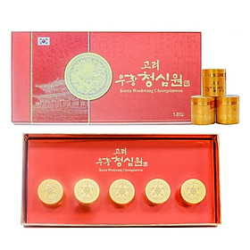 Ngưu Hoàng Thanh Tâm Hàn Quốc Hộp 5 viên Ngưu Hoàng Thanh Tâm Hàn Quốc 5 Viên là sản phẩm chủ trị dành cho người có nguy cơ tai biến mạch máu não, huyết áp cao, rối loạn tiền đình, bệnh mạch vành. Sử dụng ngưu hoàng thanh tâm là một phương thức hiệu quả giúp phòng ngừa tắc nghẽn mạch máu dẫn đến đột qụy.  Khuyến cáo: sản phẩm không phải là thuốc chữa bệnh, công dụng của nó dùng để hỗ trợ điều trị các bệnh đang chữa, bồi bổ phục hồi sức khoẻ, đọc kỹ hướng dẫn trước khi sử dụng.   Khi nhắc đến những bệnh như cao huyết áp, tắc động mạnh gây ra  tai biến mạch máu não có thể để lại di chứng nặng nề, nguy cấp hơn là có thể ảnh hưởng đến sinh mạng người bệnh. Trải qua ngàn năm nghiên cứu của các thầy thuốc xưa và nay sản phẩm Ngưu hoàng thanh tâm hoàn ra đời như một sự tất yếu giúp cho mọi người phòng chống và điều trị tai biến mạch máu não.  Woohwang Chung Sim Won (Ngưu hoàng thanh tâm hoàn Hàn Quốc ) như một loại thần dược cứu sinh. Với tính năng và tác dụng tuyệt vời của loại thần dược cứu sinh đã được sử dụng lâu đời trong dân gian và phổ biến đi khắp nơi trên thế giới, những người có tiểu sử mắc các chứng bệnh như: Cao huyết áp, tắc động mạch, tiểu đường, tai biến mạch máu não và các chứng bệnh về tim có thể coi đây là một loại thuốc tốt nhất để điều trị căn bệnh này. Ngưu hoàng thanh tâm hoàn Hàn Quốc hộp giấy đỏ là sản phẩm chính hãng, nhập khẩu từ Hàn Quốc. An cung ngưu hoàng hoàn chữ đen  là sản phẩm của công ty Wooso Hanjewon. Đây là một trong những thương hiệu An cung ngưu hoàn uy tín hàng đầu Hàn Quốc. An cung Ngưu Hoàng Hoàn được kết hợp từ 26 vị thuốc quý  Thành phần có trong 1viên Ngưu Hoàng Thanh Tâm Hộp Giấy   Chiết xuất :Nhân sâm 112mg, Cam thảo 225mg, Sơn dược 322mg, Da cừu 79mg, Đương quy 71mg, Quả mơ 72mg, Mẫu đơn trắng 72mg, Mạch môn 72mg, Hoàng cầm 72mg, Phục linh 56mg, Xuyên khung 56mg, Ngưu hoàng 14mg, Nhung hươu 76mg,Thần cốc 112mg, Thông hoàng 112mg, Thái hồ 56mg, Long não 45mg, Bách liên 37mg, Đại đậu hoàng quyên 79mg, Kim bạc 0,4mg, Cây keo 79mg, Phòng phong 72mg, Bạch truật 72mg, Càn cương 37mg, Cát cánh 56mg.    Thành phần khác : Glycerin 11mg, Microcrystalline cellulose 11mg, Canxi 11mg, Mật ong 1650mg, Đường 10,6mg vừa đủ 1 viên.  Công dụng của Ngưu Hoàng Thanh Tâm Hộp Giấy 10 Viên.