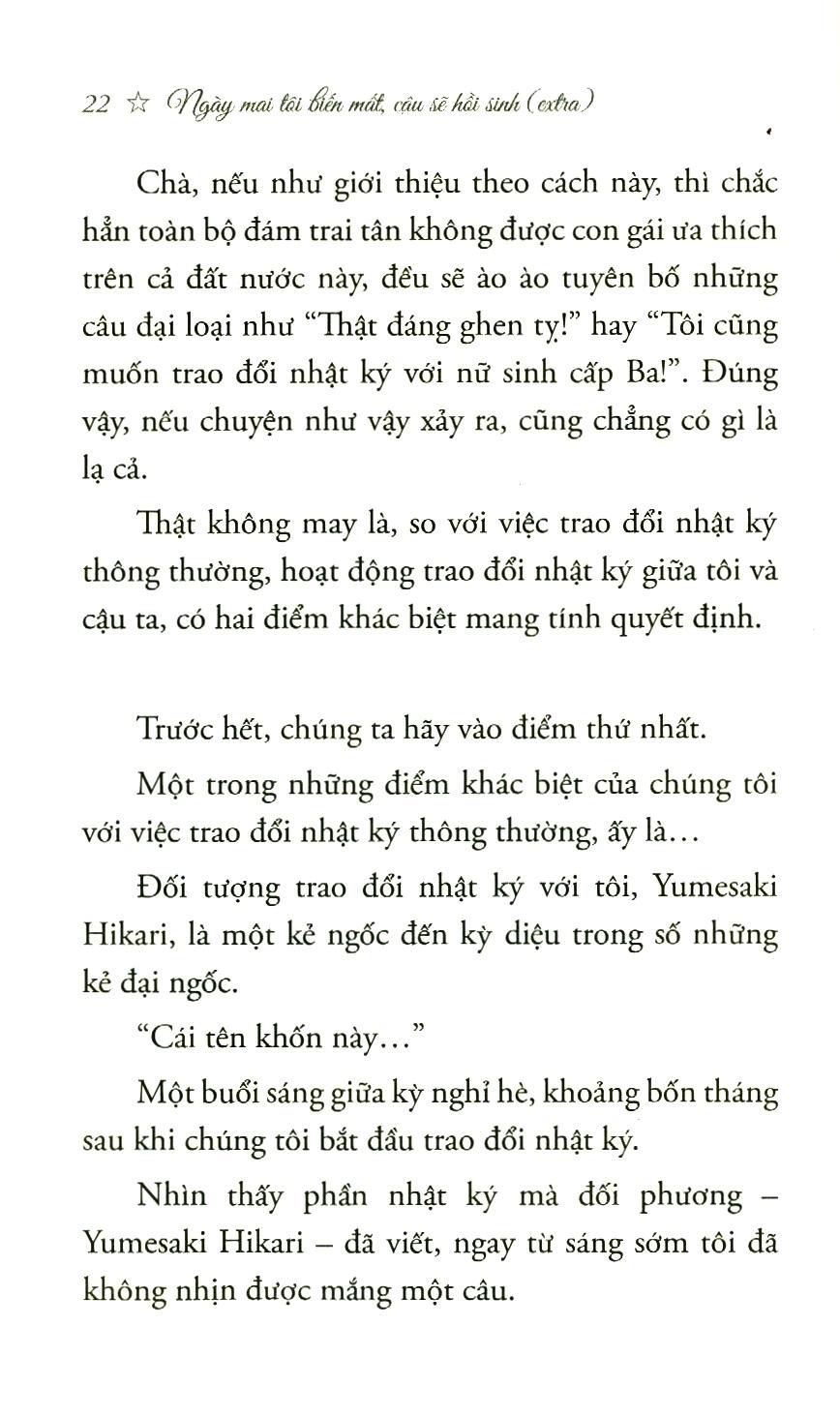 “Ngày mai, tôi biến mất, cậu sẽ hồi sinh” (tên gốc: Ashita, boku wa shinu, kimi wa ikikaeru) là tiểu thuyết đầu tay của tác giả Fujimaru, đã xuất sắc giành giải vàng (Golden prize) tại cuộc thi viết light novel lần thứ 19 của Dengeki Bunko.