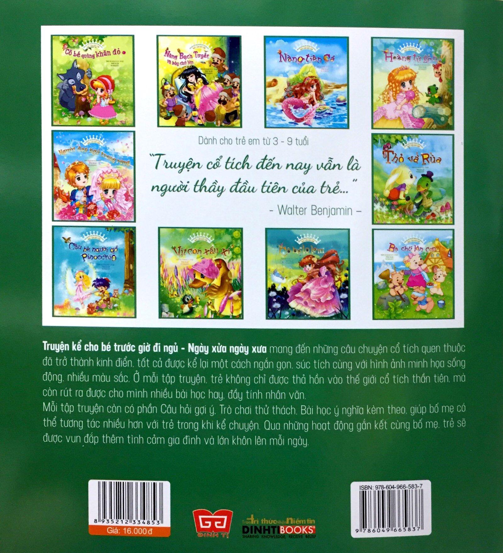 Truyện kể cho bé trước giờ đi ngủ - Ngày xửa ngày xưa mang đến những câu chuyện cổ tích quen thuộc đã trở thành kinh điển, tất cả được kể lại một cách ngắn gọn, súc tích cùng với hình ảnh minh họa sống động, nhiều màu sắc. Ở mỗi tập truyện, trẻ không chỉ được thả hồn vào thế giới cổ tích thần tiên, mà còn rút ra được cho mình nhiều bài học hay, đầy tính nhân văn.