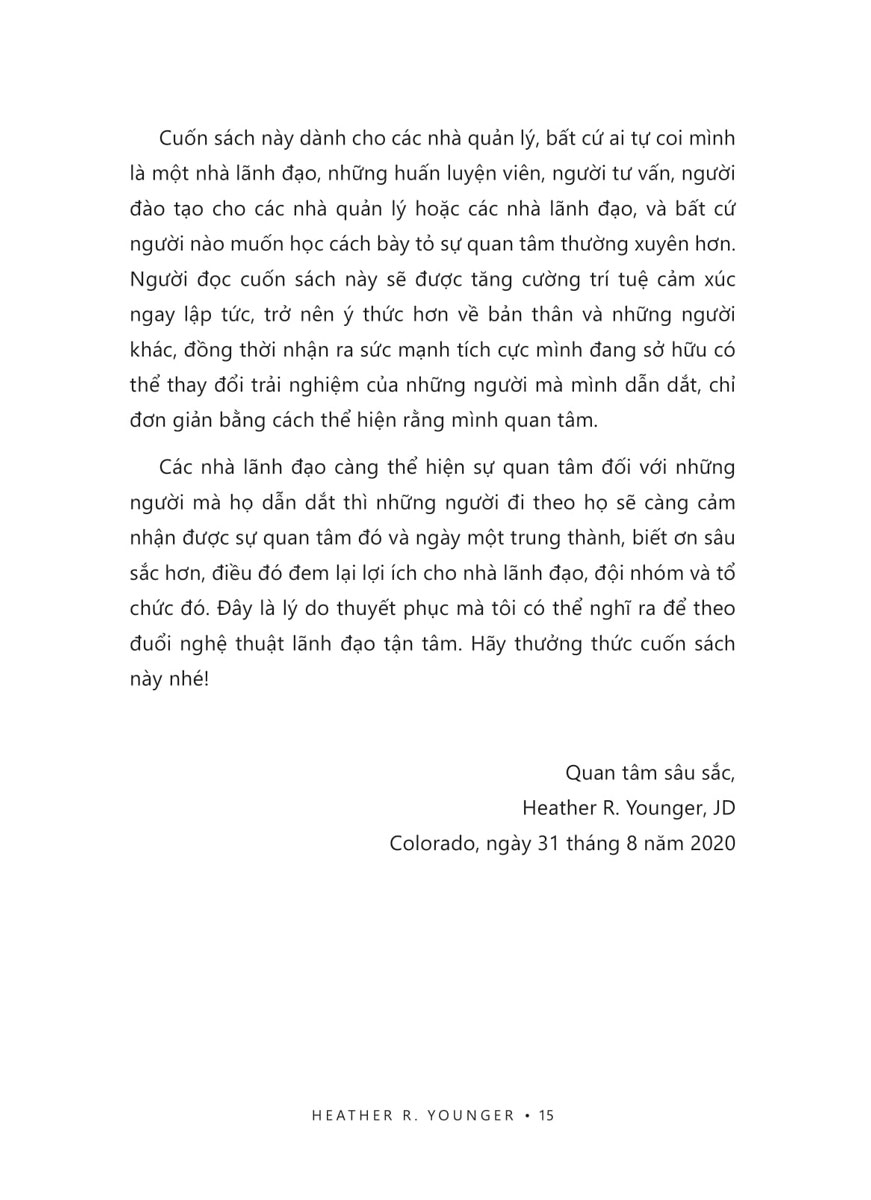Nếu bạn là những nhà lãnh đạo muốn sử dụng lòng nhân ái và sự quan tâm để dẫn dắt đội nhóm của mình đạt tới thành công, hãy bắt đầu hành trình của bạn từ chính cuốn sách này .