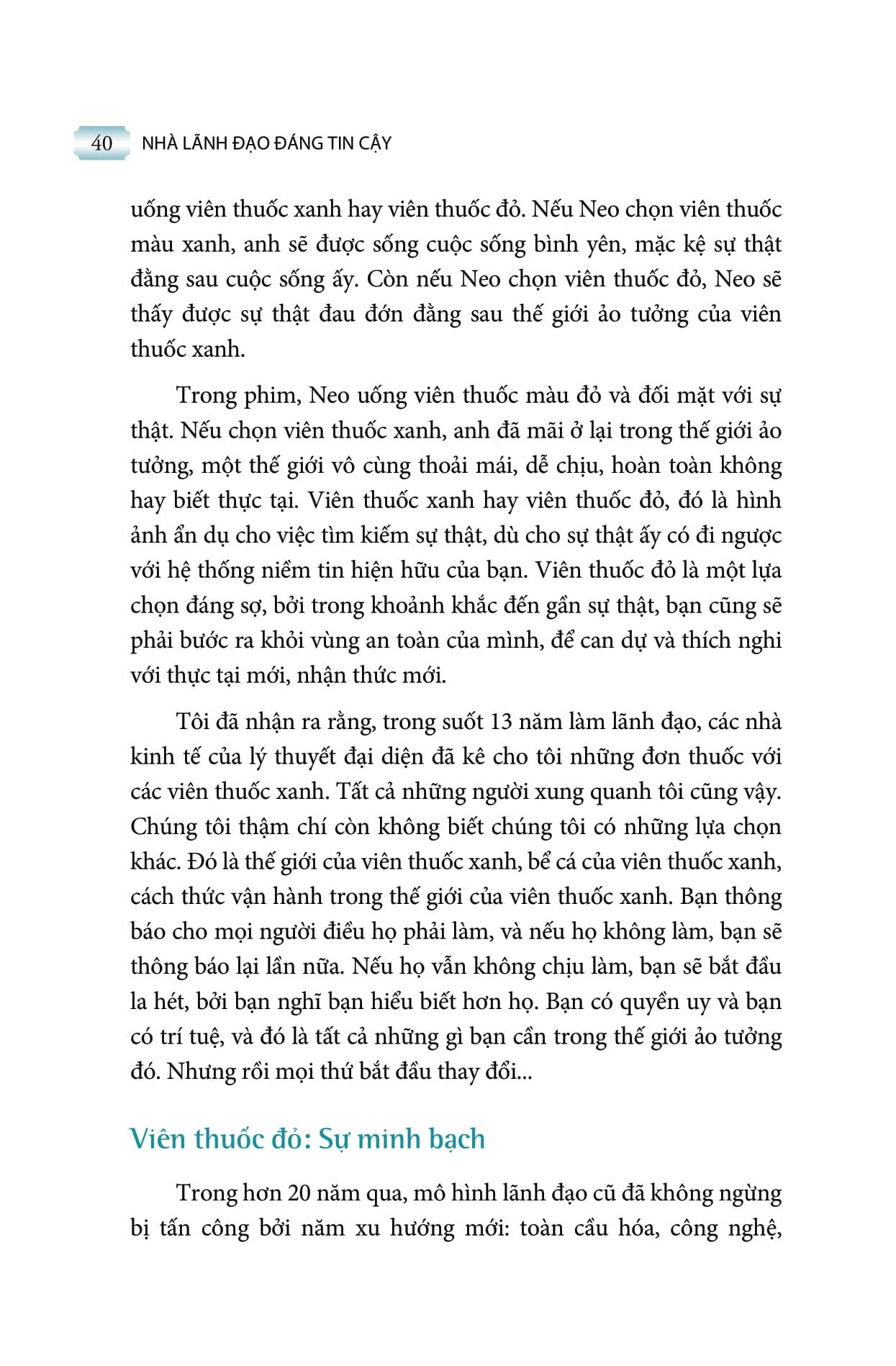 Thế giới đã sẵn sàng để tiếp nhận các phong cách lãnh đạo mới. Nếu bạn muốn trau dồi khả năng tiên liệu tình huống, trở thành người tiên phong, gặt hái được những kết quả nổi bật, có được những mối quan hệ đầy cảm hứng cũng như xây dựng được danh tiếng của mình trong lĩnh vực lãnh đạo – quản lý, thì Nhà lãnh đạo đáng tin cậy là quyển sách dành cho bạn.