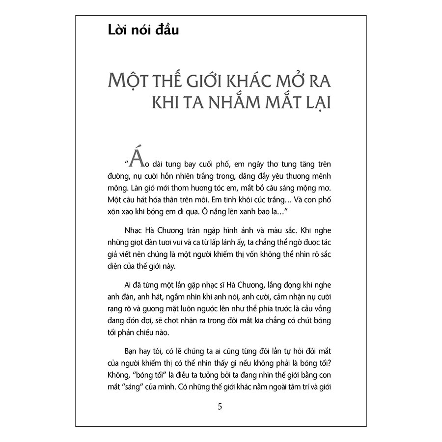 Anh đã nhắm mắt để nhìn nắng, ngắm trăng sao trong hơn nửa đời người. Từ trong bóng tối mênh mông, huyền diệu đó, anh đã khóc, đã cười, đã mạnh mẽ đứng dậy sau những lần vấp ngã. Trái tim đã tự tỏa ra ánh sáng để nhìn thấu mọi điều kỳ diệu của thế giới xung quanh theo lăng kính của riêng mình. Vì vậy thế giới của Hà Chương là thế giới của niềm tin, khát vọng, đam mê và lòng quả cảm.