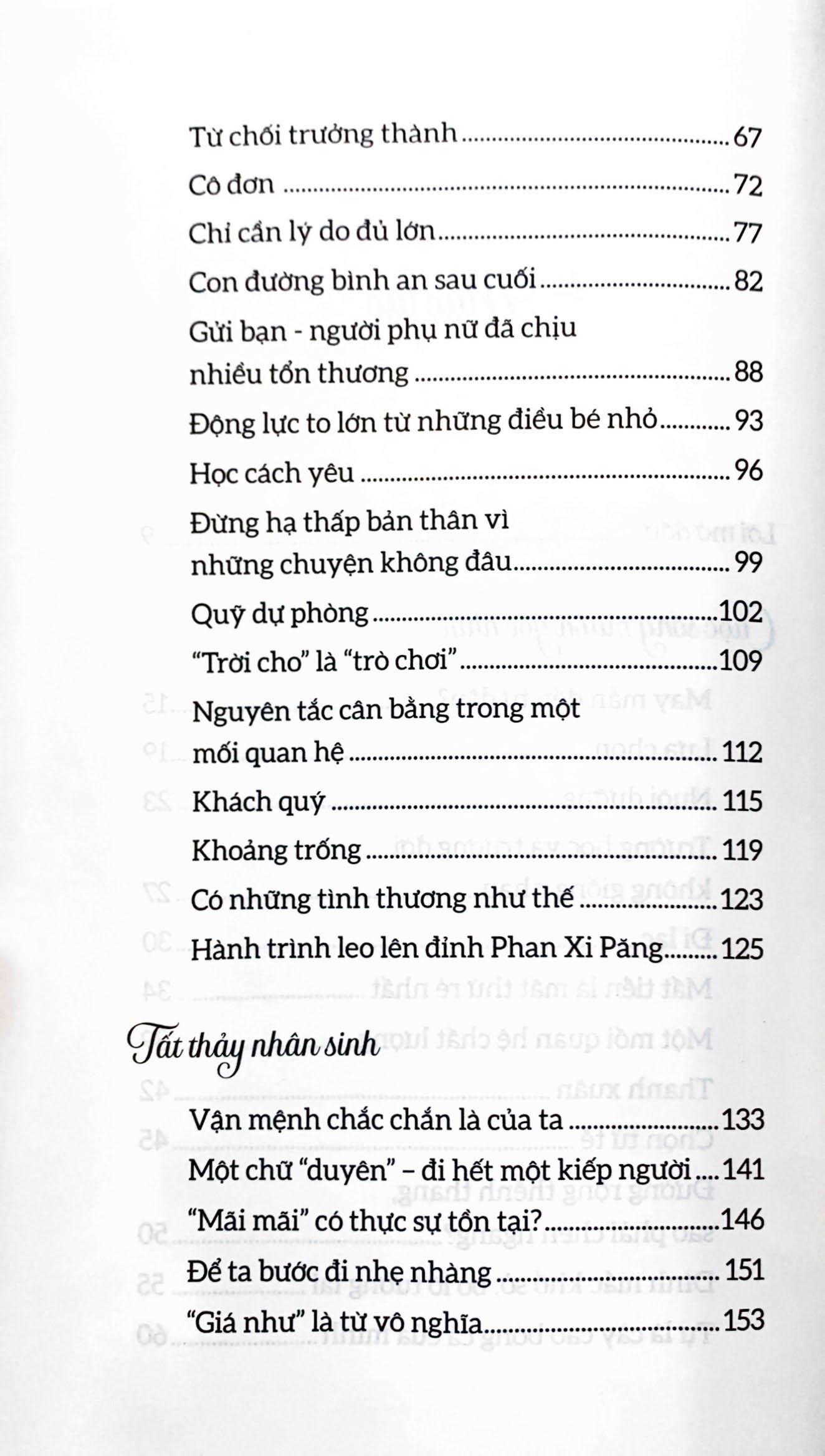 Dù gian nan vất vả hay vui sướng hạnh phúc, chỉ cần bạn nhận biết chính m.ình và trải nghiệm cuộc sống bằng cả khối óc và trái tim, bạn sẽ có cuộc đời đáng sống. Khi tâm không mong cầu, tự nhiên mọi điều ta cần sẽ xuất hiện. Ngược lại, càng mong cầu, ta càng đẩy ta ra xa điều hằng ao ước.