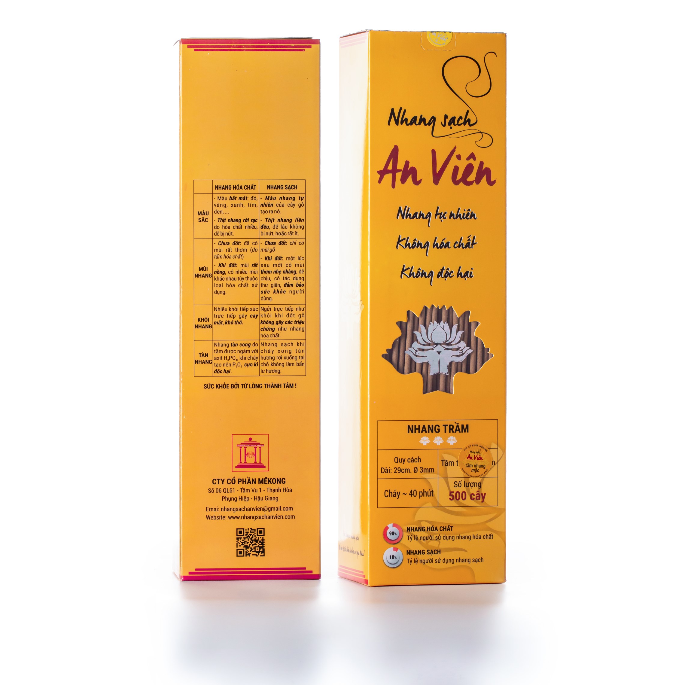 Nhang trầm An Viên 3 tấc (hộp 500 cây) Nguyên liệu: Bột trầm tự nhiên kết hợp với keo bời lời tự nhiên. Quy cách: đường kính 3mm - Dài: 29,5cm. Tăm tre nhập khẩu Đài Loan Thời gian cháy: ~ 45 phút/ cây (tùy điều kiện gió) Thích hợp sử dụng trong phòng kín, máy lạnh, tốt cho sức khỏe. Đặc biệt là nhà có trẻ nhỏ, không gây hại đường hô hấp, khí quản, tim mạch