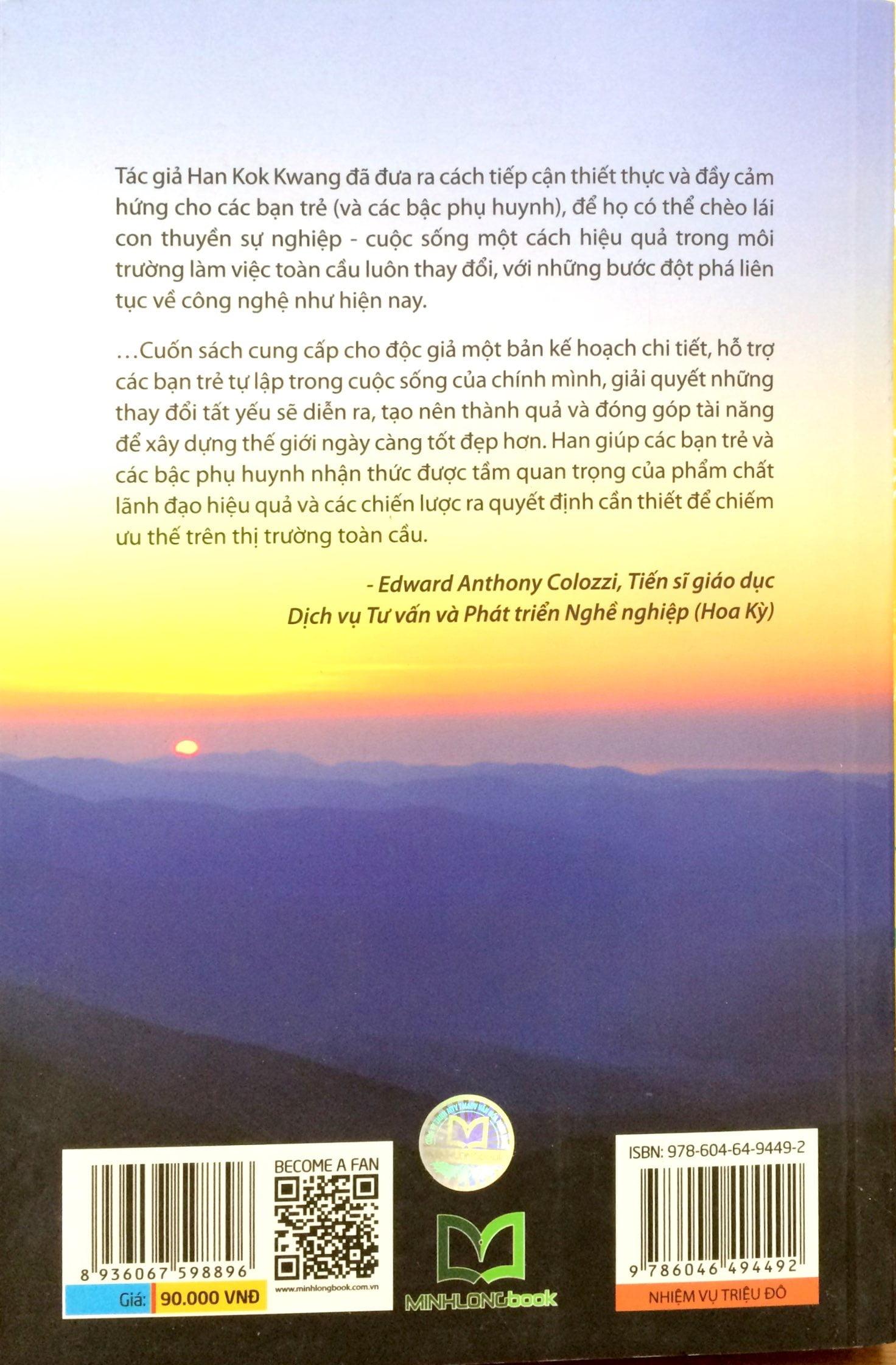 Tác giả Han Kok Kwang đưa ra cách tiếp cận thiết thực và đầy cảm hứng cho các bạn trẻ (và cha mẹ), để họ có thể chèo lái con thuyền sự nghiệp - cuộc sống một cách hiệu quả trong môi trường làm việc toàn cầu luôn thay đổi, với những bước đột phá liên tục về công nghệ như hiện nay. Han khích lệ độc giả tìm hiểu chính bản thân mình, từ đó xem xét quan niệm của họ về sự thành công, bao gồm đặt ra mục tiêu và kế hoạch thích hợp để đạt được thành công. Ai cũng có sự hiểu biết nhất định về bản thân, tuy nhiên thách thức nằm ở việc tự nhận thức được giá trị cũng như tính cách của chính mình. Phương pháp tiếp cận lấy sức mạnh làm trung tâm của Han thúc đẩy quá trình này. Cuốn sách cung cấp cho độc giả một bản kế hoạch chi tiết, hỗ trợ các bạn trẻ tự lập trong cuộc sống của chính mình, giải quyết những thay đổi tất yếu sẽ diễn ra, tạo nên thành quả và đóng góp tài năng để xây dựng thế giới ngày càng tốt đẹp hơn. Han giúp các bạn trẻ và các bậc phụ huynh nhận thức được tầm quan trọng của phẩm chất lãnh đạo hiệu quả và các chiến lược ra quyết định cần thiết để chiếm ưu thế trên thị trường toàn cầu. — Edward Anthony Colozzi, Tiến sĩ giáo dục Dịch vụ Tư vấn và Phát triển Nghề nghiệp (Hoa Kỳ)