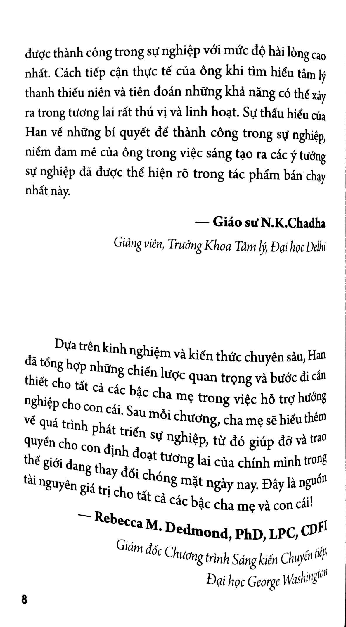 Dựa trên kinh nghiệm và kiến thức chuyên sâu, Han đã tổng hợp những chiến lược quan trọng và bước đi cần thiết cho tất cả các bậc cha mẹ trong việc hỗ trợ hướng nghiệp cho con cái. Sau mỗi chương, cha mẹ sẽ hiểu thêm về quá trình phát triển sự nghiệp, từ đó giúp đỡ và trao quyền cho con định đoạt tương lai của chính mình trong thế giới đang thay đổi chóng mặt ngày nay. Đây là nguồn tài nguyên giá trị cho tất cả các bậc cha mẹ và con cái! — Rebecca M. Dedmond, PhD, LPC, CDFI Giám đốc Chương trình Sáng kiến Chuyển tiếp, Đại học George Washington
