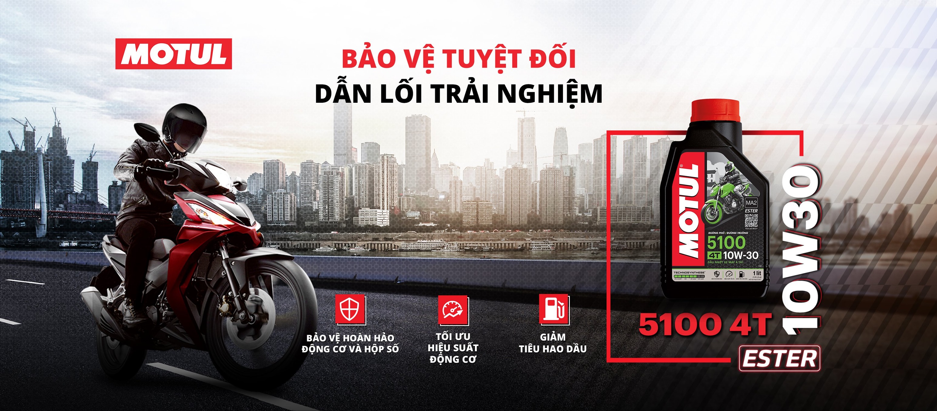 Motul 5100 4T 10W30 công nghệ Ester tổng hợp 100% API SM, MA2 - dùng đường phố đường trường, thích hợp cho xe đời mới.