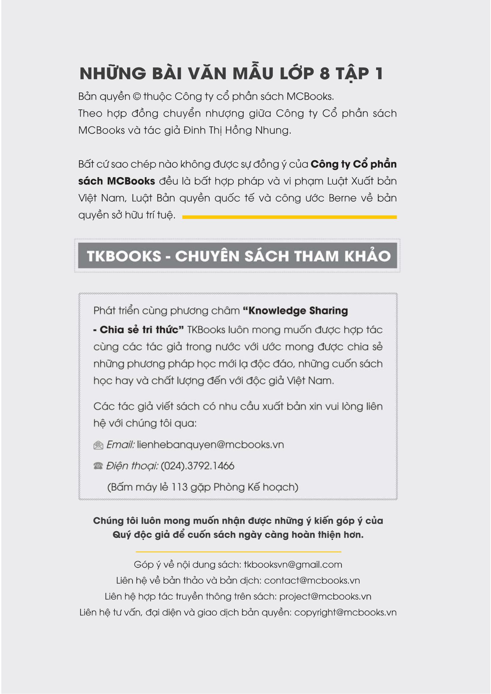 - Và có ai đã từng: Đau khổ với việc làm bài tập và bài kiểm tra? Chờ đợi may mắn và cảm hứng bất chợt? Chờ đợi thầy giỏi cô hay đến với mình? Vậy tại sao các em không tự học bằng nhiều cách, trong đó có cách tự học với những bài văn mẫu? Với mong muốn giúp đỡ cho các em học sinh lớp 8 có được tài liệu tham khảo bám sát với các bài học trên lớp và mở rộng thêm nhiều kiến thức, chúng tôi xin giới thiệu tới các em cuốn sách “Những bài văn mẫu lớp 8”. Cuốn sách văn mẫu này sẽ cung cấp cho các em học sinh lớp 8 những gì? Hướng dẫn tự học với văn mẫu đúng cách, hiệu quả Văn mẫu không phải là một cái phao cứu trợ, không phải là thứ để các em sao chép. Văn mẫu là một công cụ hữu ích cho quá trình tự học nếu các em biết dùng đúng cách. Cuốn sách này sẽ cung cấp phương pháp cụ thể cho từng kiểu bài, giúp các em có thể vận dụng linh hoạt, giải quyết tốt các đề văn khác nhau mà không lúng túng, bỡ ngỡ. Từ phương pháp các em dễ dàng hình thành cách tư duy để giải quyết một vấn đề cụ thể. Rèn kĩ năng viết các kiểu đoạn văn, bài văn tự sự, thuyết minh và nghị luận văn học “Những bài văn mẫu lớp 8” giới thiệu những đoạn, bài văn hay, hoàn chỉnh để các em tham khảo, mở rộng và làm giàu vốn từ, nâng cao khả năng diễn đạt. Từ các bài văn mẫu các em sẽ biết được để có một bài văn hay mình cần thực hiện những bước nào. Qua đó hình thành, phát triển tư duy logic, khả năng ngôn ngữ, lập luận, phản biện vấn đề. Nhờ vậy những kiểu bài tự sự hay thuyết minh, nghị luận văn học sẽ trở nên thật đơn giản với các em. Là cuốn sách đầu tiên hướng dẫn sử dụng văn mẫu có hiệu quả, chia sẻ những tiêu chí để làm được bài văn đúng và hay. Các đề văn thường kèm theo các hình ảnh minh họa thực tế giúp các em dễ dàng liên tưởng, tưởng tượng và sáng tạo câu từ. Phụ huynh và học sinh hãy nhanh tay đặt mua ngay cuốn sách bổ ích này để việc học văn của các em trở nên thú vị hơn nhé!