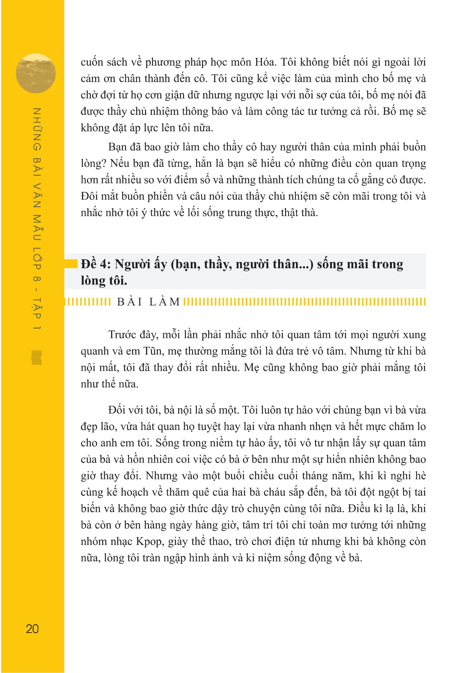 Những bài văn mẫu lớp 8 – Tập 1 Cuốn sách khơi dậy cảm hứng học tập cho các em học sinh lớp 8, đánh thức tư duy văn học, sự sáng tạo và trí tưởng tượng phong phú bằng những đề bài mới lạ, mở, có sức hút cao. Các em đang là học sinh lớp 8: