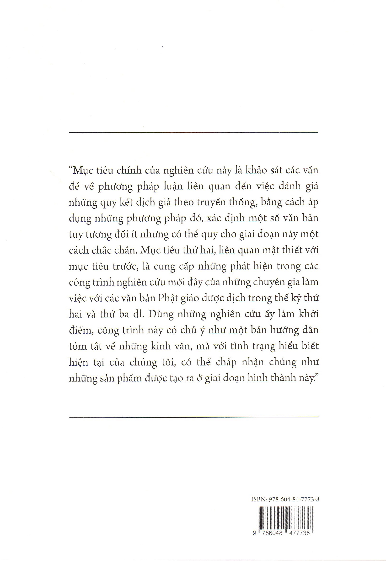 "Mục tiêu chính của nghiên cứu này là khảo sát các vấn đề về phương pháp luận liên quan đến việc đánh giá những quy kết dịch giả theo truyền thống, bằng cách áp dụng những phương pháp đó, xác định một số văn bản tuy tương đối ít những có thể quy cho giai đoạn này một cách chắc chắn. Mục tiêu thứ hai, liên quan mật thiết với mục tiêu trước, là cũng cấp những phát hiện trong các công trình nghiên cứu mới đây của những chuyên gia làm việc với các văn bản Phật giáo được dịch trong thế kỷ thứ hai và thứ ba dl. Dùng những nghiên cứu ấy làm khởi điểm, công trình này có chủ ý như một bản hướng dẫn tóm tắt về những kinh văn, mà với tình trạng hiểu biết hiện tại của chúng tôi, có thể chấp nhận chúng như những sản phẩm được tạo ra ở giai đoạn hình thành".