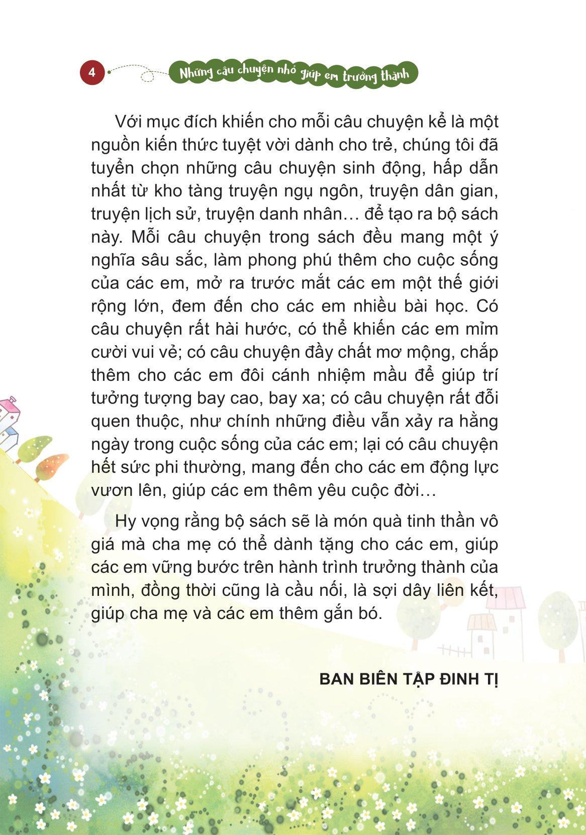 Những câu chuyện nhỏ giúp em trưởng thành là tuyển tập những câu chuyện thú vị, có tính giáo dục cao từ kho tàng truyện ngụ ngôn, truyện dân gian, truyện lịch sử, truyện danh nhân… ở khắp nơi trên thế giới. Mỗi câu chuyện trong sách đều mang một ý nghĩa sâu sắc, đem đến cho các em những bài học quý giá về cuộc sống, đồng thời truyền cảm hứng để các em rèn luyện những phẩm chất cần có như trung thực, kiên cường, tự tin, lương thiện… Từ đó, các em sẽ xây dựng được một nền tảng đạo đức tốt đẹp, giúp các em phát triển và hoàn thiện bản thân để luôn vững bước trên hành trình trưởng thành của mình.