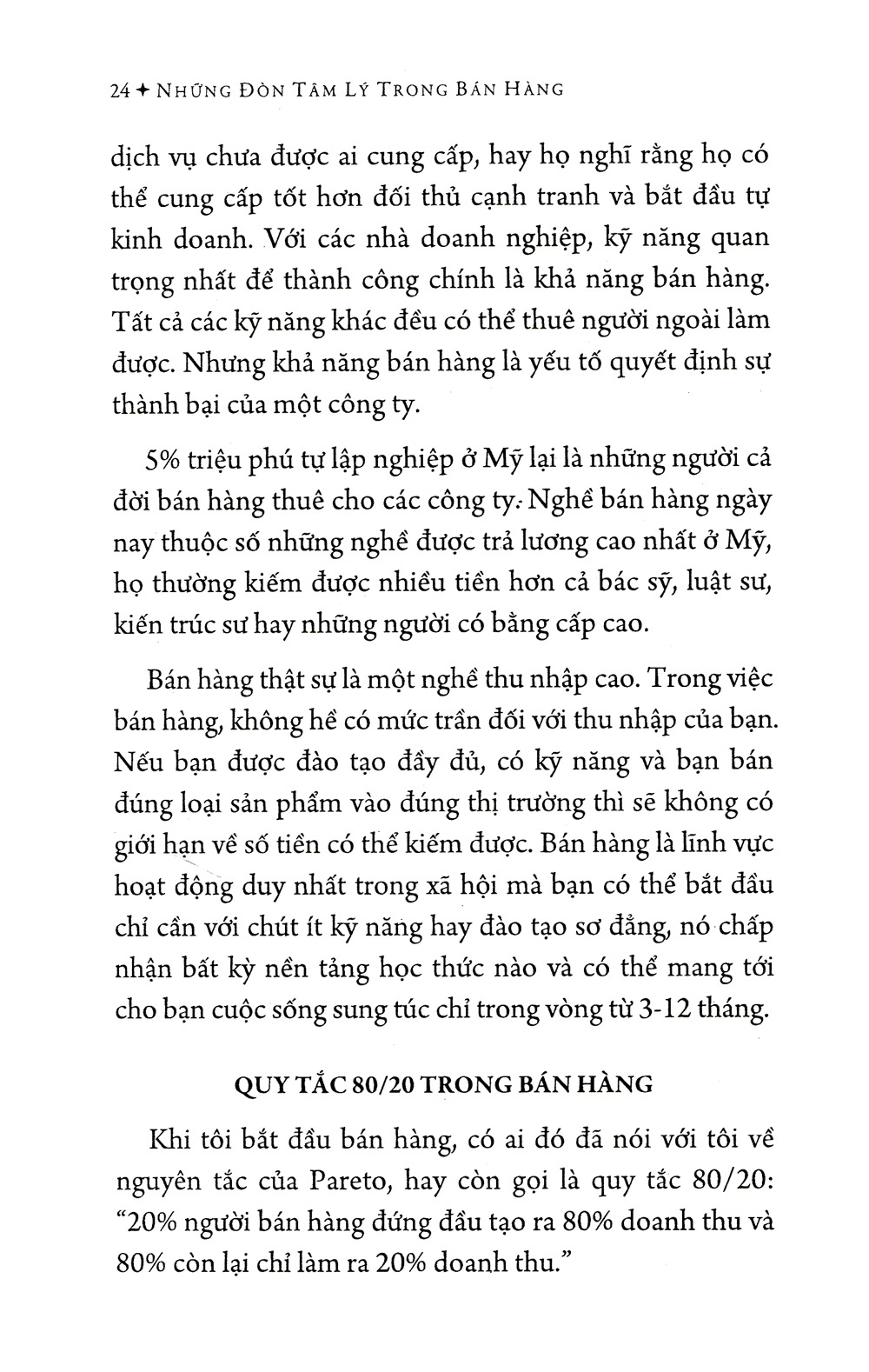Những Đòn Tâm Lý Trong Bán Hàng (Psychology Of Selling) chính là nghệ thuật bán hàng mà Brian Tracy, một doanh nhân thành đạt, đúc rút từ chính câu chuyện khởi nghiệp của cuộc đời ông. Trong bán hàng, bạn chỉ cần giỏi hơn và khác biệt chút đỉnh trong mỗi công đoạn để tích lũy và dần tạo nên một khác biệt lớn về thu nhập. Nếu bạn là người bán hàng mà lại sợ bị từ chối, bạn đã chọn sai cách kiếm sống. Khách hàng không quan tâm sản phẩm của bạn là gì. Họ chỉ quan tâm sản phẩm hay dịch vụ của bạn có ích gì cho họ. Bí quyết của thành công trong kinh doanh dành cho bạn là hãy bắt đầu sớm hơn một chút, làm việc chăm chỉ hơn một chút và ở lại lâu hơn một chút. Đọc Những Đòn Tâm Lý Trong Bán Hàng (Psychology Of Selling, bạn sẽ biết đến khái niệm "khả năng thành công" - một trong những ý tưởng quan trọng nhất về bán hàng và quản lý thế kỷ 21, biết đến khái niệm "cây anh đào nở hoa", hoặc bạn cần sử dụng kinh nghiệm, kỹ năng sáng tạo nào để bạn trở thành người bán hàng chuyên nghiệp và khách hàng cũng thành người mua chuyên nghiệp. Những Đòn Tâm Lý Trong Bán Hàng khuyên bạn: Hãy tự đặt mình vào vị trí của người mua, bạn sẽ bán được hàng. Nếu bây giờ bạn không, hoặc không dự định kinh doanh, bạn cũng hãy tin rằng kiến thức kinh doanh bằng tâm lý mang đến cho bạn không hề vô ích