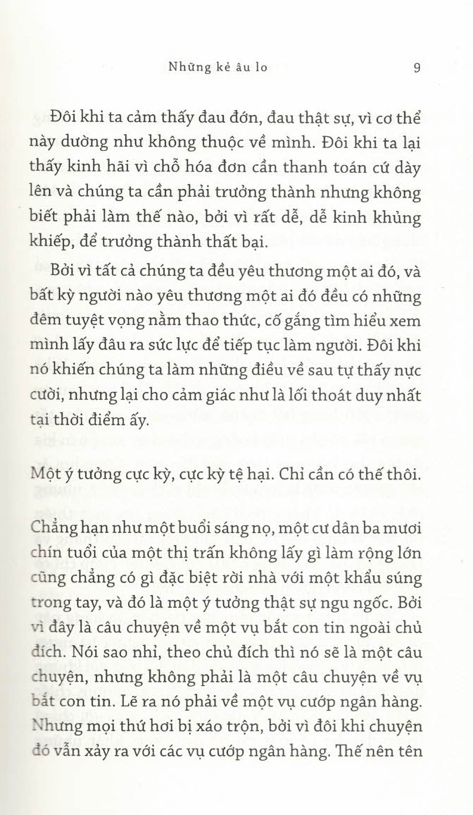 - Giới thiệu tóm tắt tác phẩm: Từ tác giả cuốn sách bán chạy số 1 New York Times – Người đàn ông mang tên Ove “Một cuốn tiểu thuyết khác thường, đầy lòng trắc ẩn… Hài hước, tinh quái và buồn cười đau ruột, đây là một câu chuyện hoàn toàn nguyên bản mang đến niềm vui trong trẻo.” – People “Backman một lần nữa nắm bắt được bản chất rối rắm của việc làm người… Cuốn sách tài tình và có sức ảnh hưởng, có thể khiến bạn cười thành tiếng cũng như khiến bạn khóc.” – Washington Post Một tên cướp ngân hàng thất bại đã xông vào một căn hộ đang mở cửa và bắt giữ tất cả những người trong đó làm con tin. Đây là những khách mua nhà tiềm năng đang tham quan căn hộ: một cặp vợ chồng mới nghỉ hưu đang nỗ lực hàn gắn hôn nhân, một giám đốc ngân hàng giàu có quá bận rộn để quan tâm đến bất kỳ ai, một cặp đôi trẻ chuẩn bị đón con đầu lòng nhưng có vẻ không có tiếng nói chung trong bất kỳ việc gì, một bà cụ tám bảy tuổi đã sống đủ lâu để không biết sợ một kẻ gí súng vào mặt, một người môi giới nhà đất bối rối nhưng vẫn sẵn sàng ngã giá và một người đàn ông bí ẩn đang giam mình trong phòng tắm duy nhất của căn hộ. Nhóm con tin tồi tệ nhất trên đời. Mỗi người trong số họ đều cất giấu một cuộc đời đầy thương tổn, đau đớn, bí mật và đam mê sẵn sàng sôi trào. Không ai trong số họ là hoàn toàn như những gì họ thể hiện ra. Và tất cả trong số họ – kể cả tên cướp ngân hàng – đều khao khát được giải cứu. Khi nhà chức trách và giới truyền thông bao vây khu căn hộ, những đồng minh bất đắc dĩ này sẽ tiết lộ những sự thật không ngờ về bản thân và kích hoạt một chuỗi sự việc không ai có thể đoán định hay giải thích. Vẫn là “phong cách đối thoại hoàn hảo và sự hiểu biết vô song về bản chất con người” (Shelf Awareness), Anxious People là một câu chuyện được xây dựng khéo léo về sức mạnh của tình bạn, sự tha thứ và hi vọng – những thứ giải cứu chúng ta ngay cả trong những lúc nguy ngập nhất.