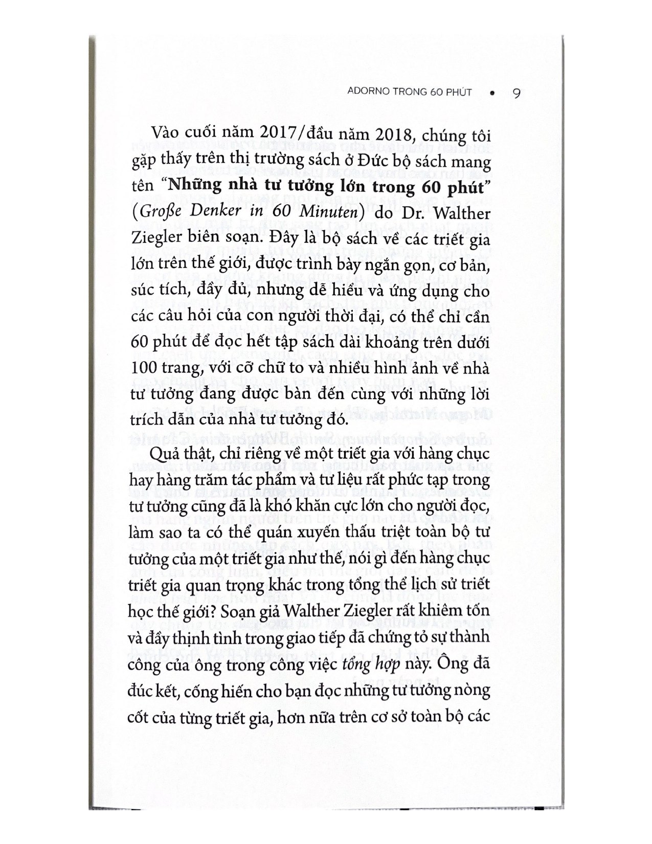 Adorno cho đến ngày hôm nay là một trong những nhà tư tưởng thông thái và thiên bẩm nhất trong lịch sử triết học. “Lý thuyết Phê phán” về xã hội của ông vừa cấp tiến vừa kích động. Theo Adorno, tất cả chúng ta đang sống trong một thế giới hoàn toàn bị chủ nghĩa tư bản thao túng. Thời đại Khai minh với hy vọng lớn về tiến bộ và giải phóng đã bị lộn ngược.
