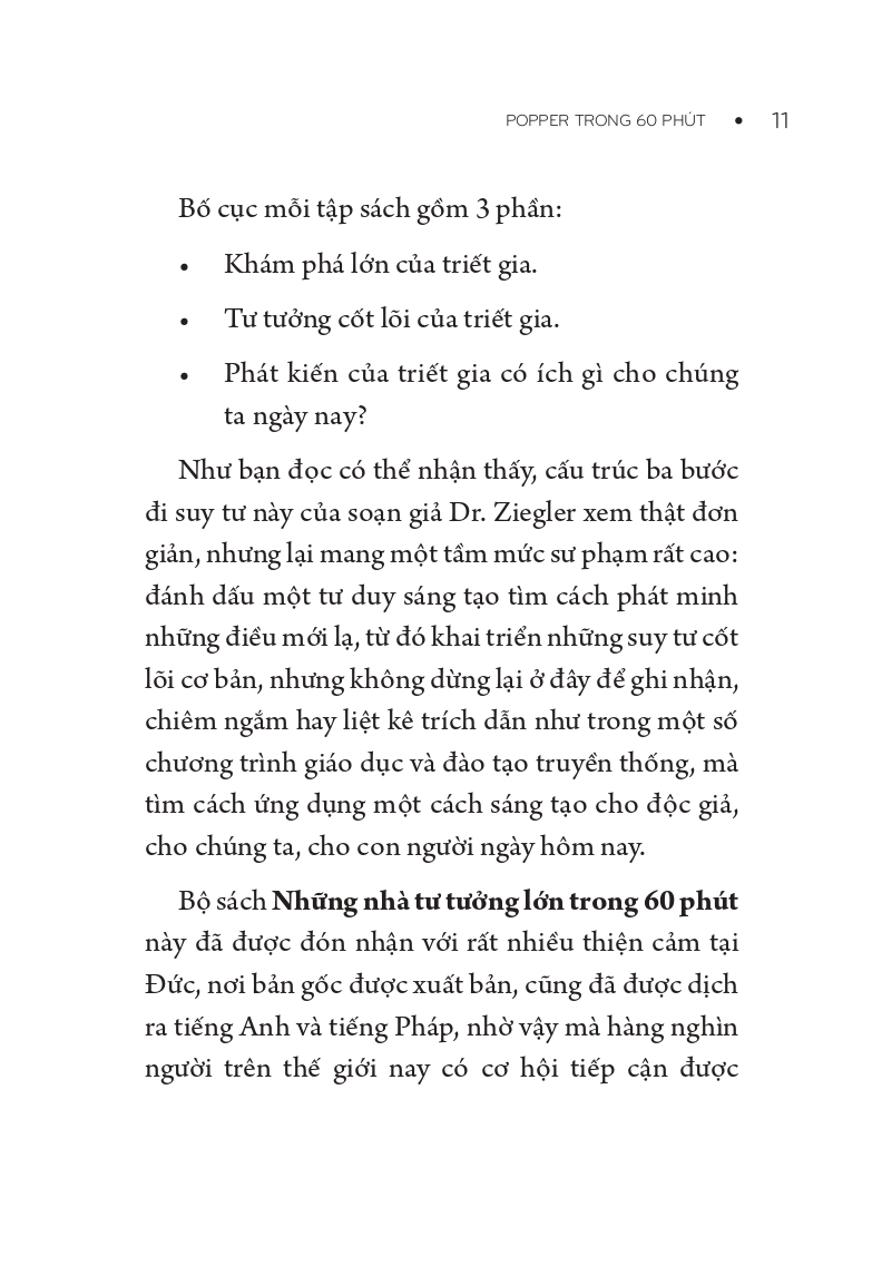 - Giới thiệu Những Nhà Tư Tưởng Lớn - Popper In 60 Minuten - Popper Trong 60 Phút Popper nêu ra lý tưởng về khoa học của “xã hội mở“: Mọi lý thuyết khoa học đều chỉ có giá trị hiệu lực cho đến khi nó bị phản bác bởi một ví dụ phản chứng hoặc bị thay thế bởi một lý thuyết chính xác hơn. Xã hội phải luôn luôn cởi mở đối với việc phê phán và đổi mới nhận thức của chúng ta Phương pháp thử và sai in dấu ấn lên sự tiến hóa. Từ muôn thuở, thực vật và động vật tối ưu hóa cơ may sống còn bằng những đột biến thất bại và thành công: Khoảng cách từ trùng a-míp đến Einstein chỉ là một bước. Triết học cho mọi người! Bộ sách Những nhà tư tưởng lớn lần đầu tiên trình bày sâu sắc công trình của các nhà triết học quan trọng nhất: Dễ hiểu, thú vị và rất thời sự.” – Martin Politowski “Tất cả đều được trình bày hết sức rành mạch: Phê phán của Popper đối với mọi chủ nghĩa toàn trị, yêu sách về xã hội mở, sự khích lệ những bước đi táo bạo trong khoa học và chính trị. Một gợi ý quan trọng trong thế giới đang tự mãn với chủ nghĩa tiêu thụ và lúng túng trong chính trị.”