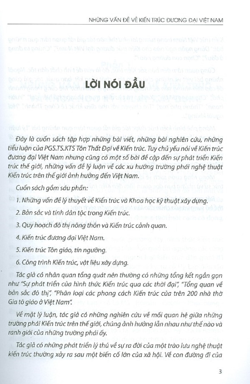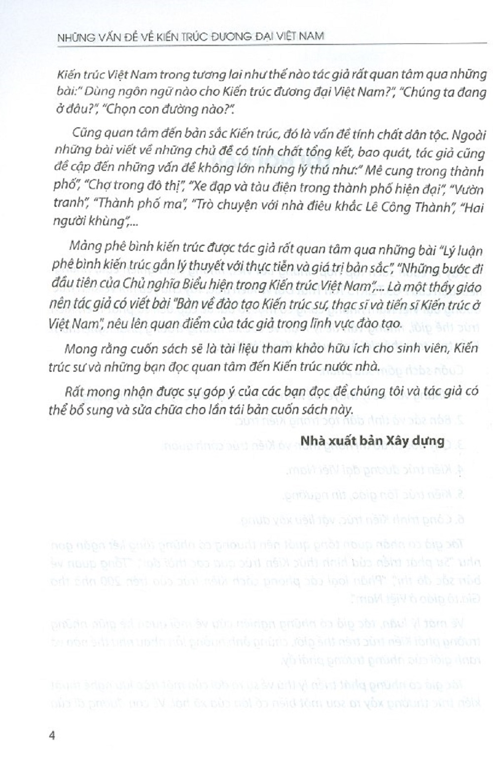 - Công trình Kiến trúc, vật liệu xây dựng. Tác giả có nhân quan tổng quát nên thường có những tổng kết ngắn gọn như “Sự phát triển của hình thức Kiến trúc qua các thời đại” “Tổng quan về bản sắc đô thị” “Phân loại các phong cách kiến trúc của trên 200 nhà thờ Gia tô giáo ở Việt Nam” Về mặt lý luận, tác giả có những nghiên cứu về mối quan hệ giữa những trường phải Kiến trúc trên thế giới, chúng ảnh hưởng lẫn nhau như thế nào và ranh giới của những trường phái ấy. Kiến trúc Việt Nam trong tương lai như thế nào tác giả rất quan tâm qua những bài:” Dùng ngôn ngữ nào cho Kiến trúc đương đại Việt Nam? “Chúng ta đang đâu?” “Chọn con đường nào?” Cũng quan tâm đến bản sắc Kiến trúc, đó là vấn đề tính chất dân tộc. Ngoài những bài viết về những chủ đề có tính chất tổng kết, bao quát, tác giả cũng để cập đến những vấn đề không lớn nhưng lý thú như:* Mê cung trong thành phố” “Chợ trong đô thị” “Xe đạp và tàu điện trong thành phố hiện đại” “Vườn tranh” “Thành phố ma” “Trò chuyện với nhà điêu khắc Lê Công Thành” “Hai người khù Mảng phê bình kiến trúc được tác giả rất quan tâm qua những bài “Lý luận phê bình kiến trúc gần lý thuyết với thực tiễn và giá trị bản sắc” “Những bước đi đầu tiên của Chủ nghĩa Biểu hiện trong Kiến trúc Việt N Là một thầy giáo nên tác giả có viết bài "Bàn về đào tạo Kiến trúc sư, thạc sĩ và tiến sĩ Kiến trúc ở Việt Nam" nêu lên quan điểm của tác giả trong lĩnh vực đào tạo. Mong rằng cuốn sách sẽ là tài liệu tham khảo hữu ích cho sinh viên, Kiến trúc sư và những bạn đọc quan tâm đến Kiến trúc nước nhà.